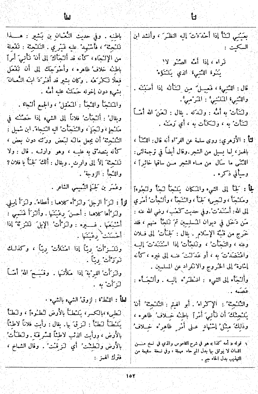 قَالَ: اللَّتِيءُ، فَعِيلٌ مِن لَتَأْتُه إِذَا أَصَبْتَه. واللَّتِيءُ المَلْتِيُّ: المَرْمِيُّ. ولَتَأَتْ بِهِ أُمُّه: ولَدَته. يُقَالُ: لَعَنَ اللَّهُ أُمّاً لَتَأَتْ بِهِ، ولَكَأَت بِهِ، أَي رَمَتْه.