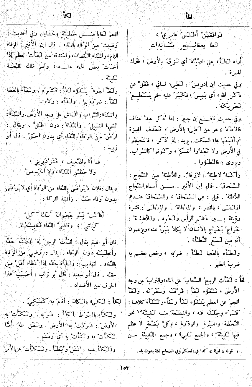 لفأ: لَفَأَت الريحُ السَّحابَ عَنِ الماءِ، والترابَ عَنْ وجه الأَرض، تَلْفَؤُه لَفْأً: فَرَّقَتْه وسَفَرَتْه. ولَفَأَ اللحمَ عن العظم يَلْفَؤُه لَفْأً ولَفاً، والْتَفَأَه كِلَاهُمَا: قَشَرَه وجَلَفَه عَنْهُ، والقِطْعةُ مِنْهُ لَفيِئَةٌ «1» نَحْوُ النَّحْضة والهَبْرةِ والوذْرةِ، وكلُّ بَضْعةٍ لَا عَظْمَ فِيهَا لَفِيئةٌ، وَالْجَمْعُ لَفِيءٌ، وَجَمْعُ اللَّفِيئَةِ مِنَ اللَّحْمِ لَفايا مِثْلَ خَطِيئةٍ وخَطايا. وَفِي الْحَدِيثِ: