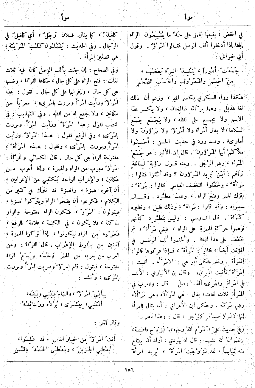 قَالَ ابْنُ الأَثير: هُوَ جَمْعُ المَرْءِ، وَهُوَ الرَّجل. وَمِنْهُ قَوْلُ رُؤْبةَ لِطائفةٍ رَآهم: أَيْنَ يُرِيد المَرْؤُونَ؟ وَقَدْ أَنَّثوا فَقَالُوا: مَرْأَةٌ، وخَفَّفوا التَّخْفِيفَ الْقِيَاسِيَّ فَقَالُوا: مَرَةٌ، بِتَرْكِ الْهَمْزِ وَفَتْحِ الراءِ، وَهَذَا مطَّرد. وَقَالَ سِيبَوَيْهِ: وَقَدْ قَالُوا: مَراةٌ، وَذَلِكَ قَلِيلٌ، وَنَظِيرُهُ كَمَاةٌ. قَالَ الْفَارِسِيُّ: وَلَيْسَ بمُطَّرِد كأَنهم تَوَهَّمُوا حَرَكَةُ الْهَمْزَةِ عَلَى الرَّاءِ، فَبَقِيَ مَرَأْةً، ثُمَّ خُفِّف عَلَى هَذَا اللَّفْظِ. وأَلحقوا أَلف الْوَصْلِ فِي المؤَنث أَيضاً، فَقَالُوا: امْرأَةٌ، فَإِذَا عرَّفوها قَالُوا: المَرأة. وَقَدْ حَكَى أَبو عَلِيٍّ: الامْرَأَة. اللَّيْثُ: امْرَأَةٌ تأْنيث امْرِئٍ. وَقَالَ ابْنُ الأَنباري: الأَلف فِي امْرأةٍ وامْرِئٍ أَلف وَصْلٍ. قَالَ: وَلِلْعَرَبِ فِي المَرأَةِ ثَلَاثُ لُغَاتٍ، يُقَالُ: هِيَ امْرَأَتُه وَهِيَ مَرْأَتُه وَهِيَ مَرَتُه. وَحَكَى ابْنُ الأَعرابي: أَنه يُقَالُ للمرأَة إِنَّهَا لَامْرُؤُ صِدْقٍ كالرَّجل، قَالَ: وَهَذَا نَادِرٌ. وَفِي حَدِيثِ