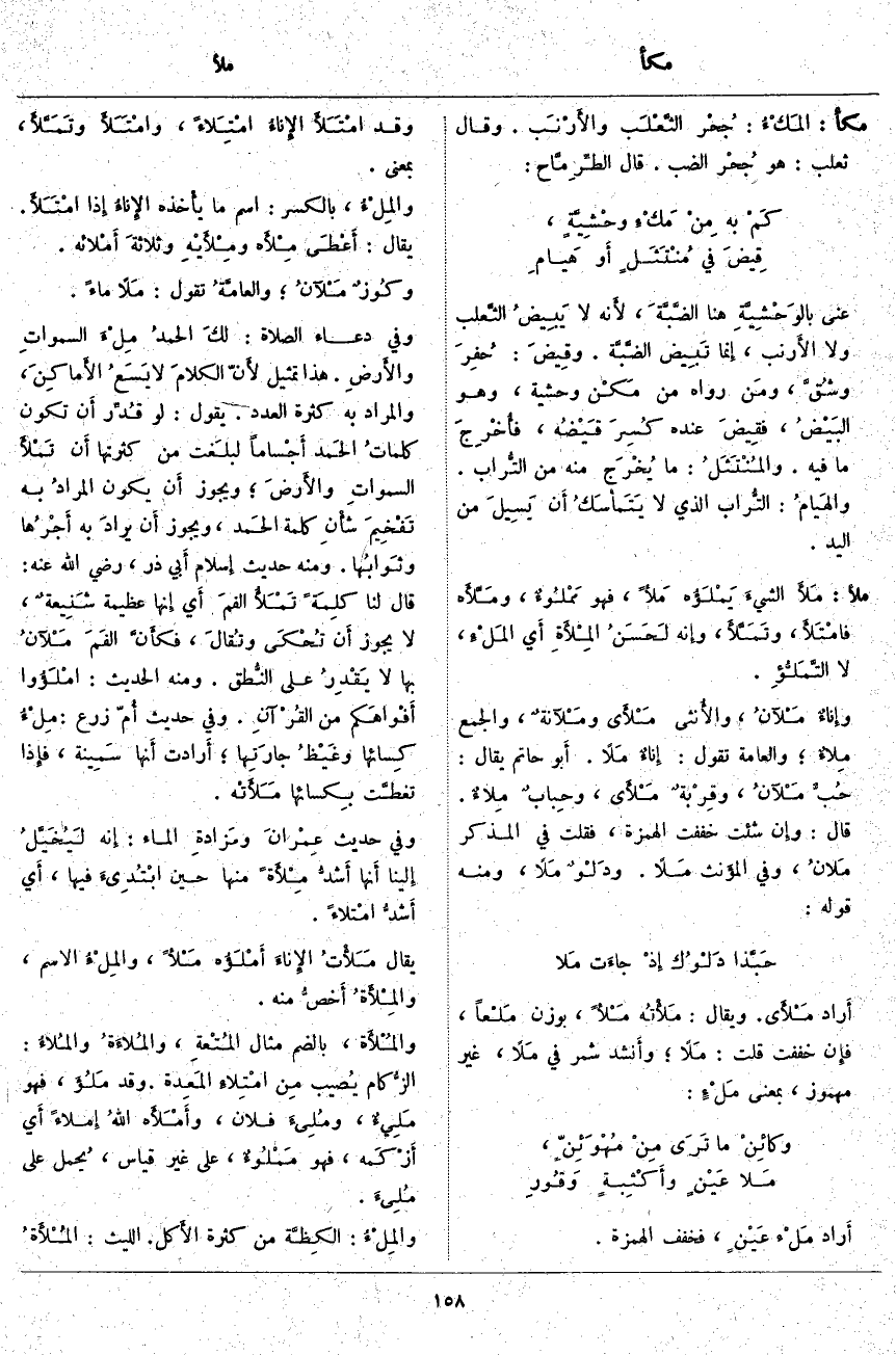 ملأَ: مَلأَ الشيءَ يَمْلَؤُه مَلأً، فَهُوَ مَمْلُوءٌ، ومَلَّأَه فامْتَلأَ، وتَمَلَّأَ، وَإِنَّهُ لَحَسَنُ المِلأَةِ أَي المَلْءِ، لَا التَّمَلُّؤِ. وإِناءٌ مَلآنُ، والأُنثى مَلأَى ومَلآنةٌ، وَالْجَمْعُ مِلاءٌ؛ وَالْعَامَّةُ تَقُولُ: إِناءٌ مَلًا. أَبو حَاتِمٍ يُقَالُ: حُبٌّ مَلآنُ، وقِرْبةٌ مَلأَى، وحِبابٌ مِلاءٌ. قَالَ: وَإِنْ شِئْتَ خَفَّفْتَ الْهَمْزَةَ، فَقُلْتَ فِي الْمُذَكَّرِ مَلانُ، وَفِي المؤَنث مَلًا. ودَلْوٌ مَلًا، وَمِنْهُ قَوْلُهُ: