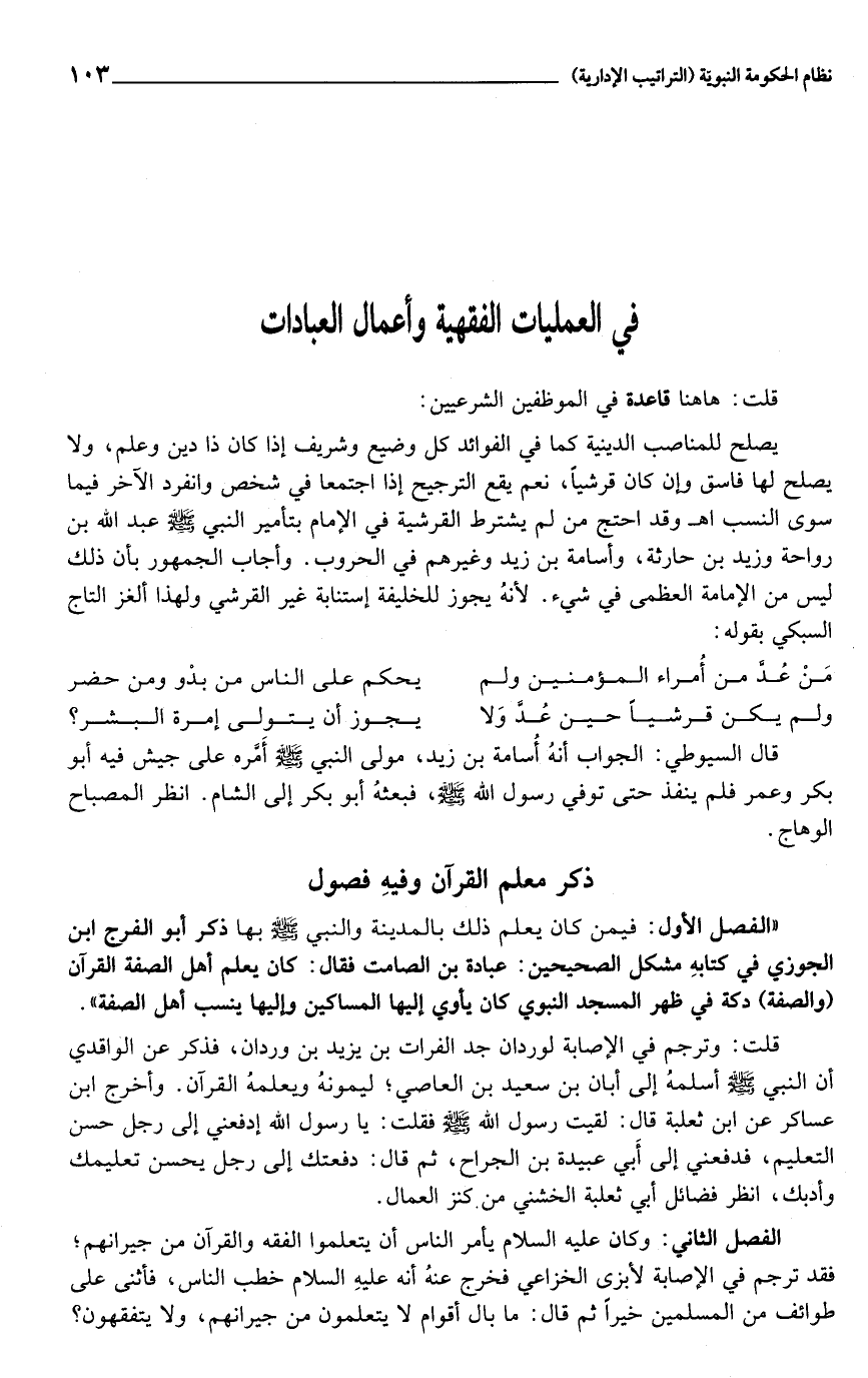 يصلح للمناصب الدينية كما في الفوائد كل وضيع وشريف إذا كان ذا دين وعلم، ولا يصلح لها فاسق وإن كان قرشيا، نعم يقع الترجيح إذا اجتمعا في شخص وانفرد الآخر فيما سوى النسب اهـ وقد احتج من لم يشترط القرشية في الإمام بتأمير النبي صلى الله عليه وسلم عبد الله بن رواحة وزيد بن حارثة، وأسامة بن زيد وغيرهم في الحروب. وأجاب الجمهور بأن ذلك ليس من الإمامة العظمى في شيء. لأنه يجوز للخليفة إستنابة غير القرشي ولهذا ألغز التاج السبكي بقوله: