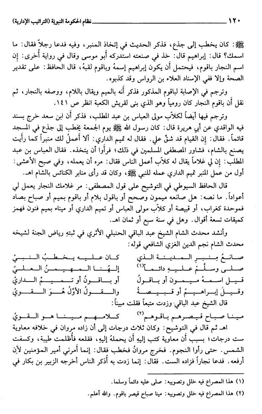 وترجم فيها أيضا لكلّاب مولى العباس بن عبد المطلب، فذكر أن ابن سعد خرج بسند فيه الواقدي عن أبي هريرة قال: كان رسول الله صلى الله عليه وسلم يوم الجمعة يخطب إلى جذع في المسجد قائما. فقال: إن القيام قد شقّ علي. فقال له تميم الداري: ألا أعمل لك منبرا كما رأيت يصنع بالشام، فشاور المصطفى المسلمين في ذلك؛ فرأوا أن يتخذه. فقال العباس بن عبد المطلب: إن لي غلاما يقال له كلّاب أعمل الناس فقال: مره أن يعمله، وفي صبح الأعشى: