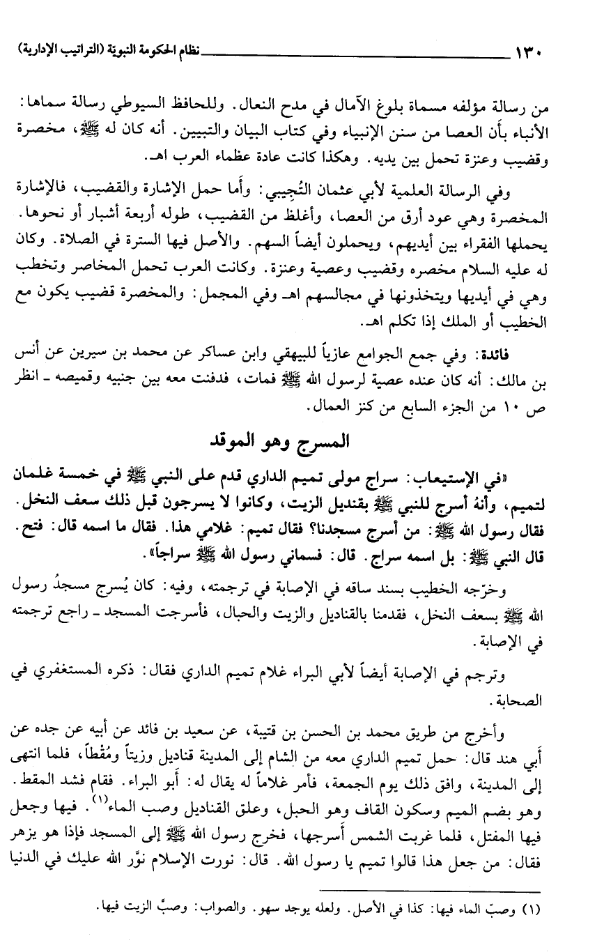 «في الإستيعاب: سراج مولى تميم الداري قدم على النبي صلى الله عليه وسلم في خمسة غلمان لتميم، وأنه أسرج للنبي صلى الله عليه وسلم بقنديل الزيت، وكانوا لا يسرجون قبل ذلك سعف النخل.