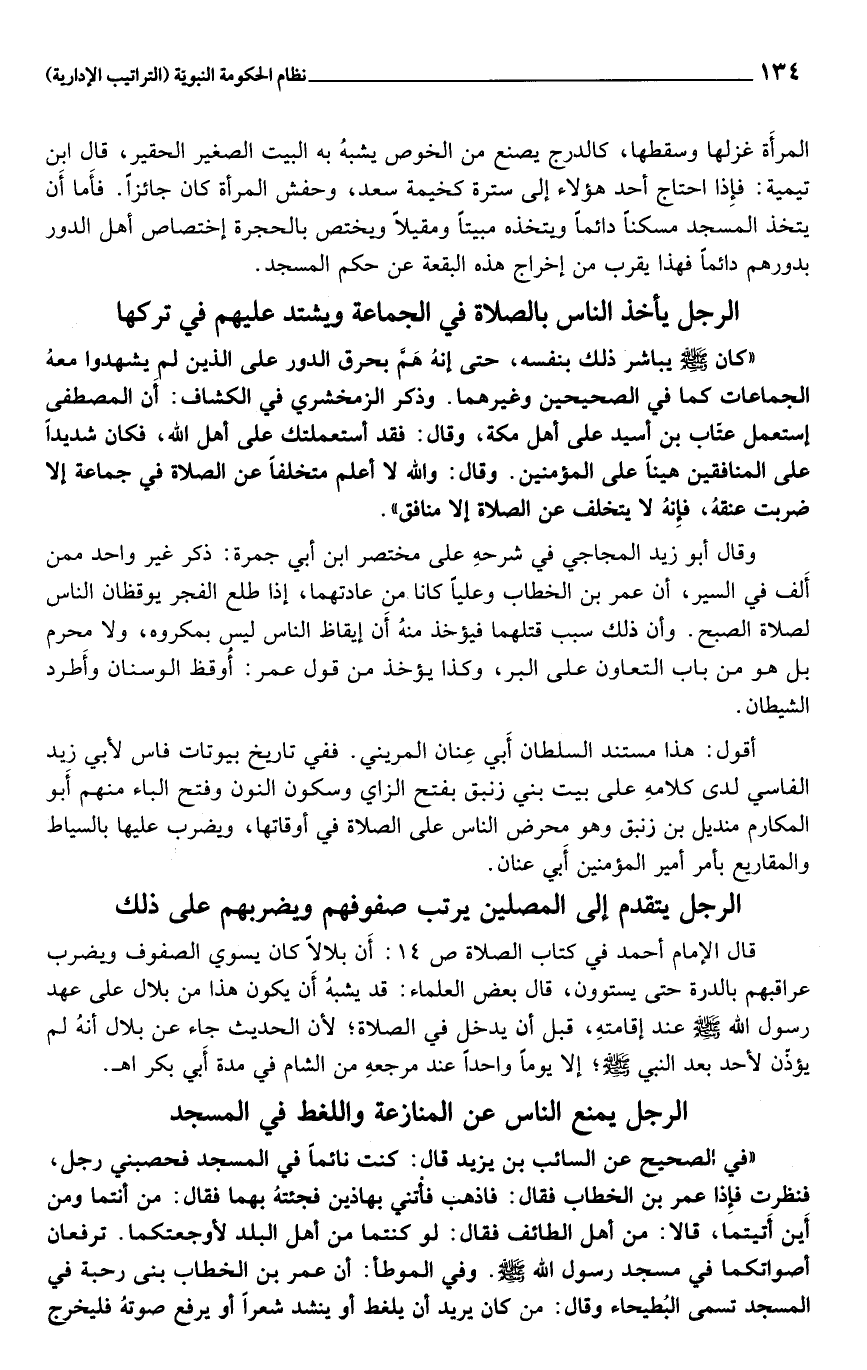 «كان صلى الله عليه وسلم يباشر ذلك بنفسه، حتى إنه همّ بحرق الدور على الذين لم يشهدوا معه الجماعات كما في الصحيحين وغيرهما. وذكر الزمخشري في الكشاف: أن المصطفى إستعمل عتّاب بن أسيد على أهل مكة، وقال: فقد أستعملتك على أهل الله، فكان شديدا على المنافقين هينا على المؤمنين. وقال: والله لا أعلم متخلفا عن الصلاة في جماعة إلا ضربت عنقه، فإنه لا يتخلف عن الصلاة إلا منافق» .