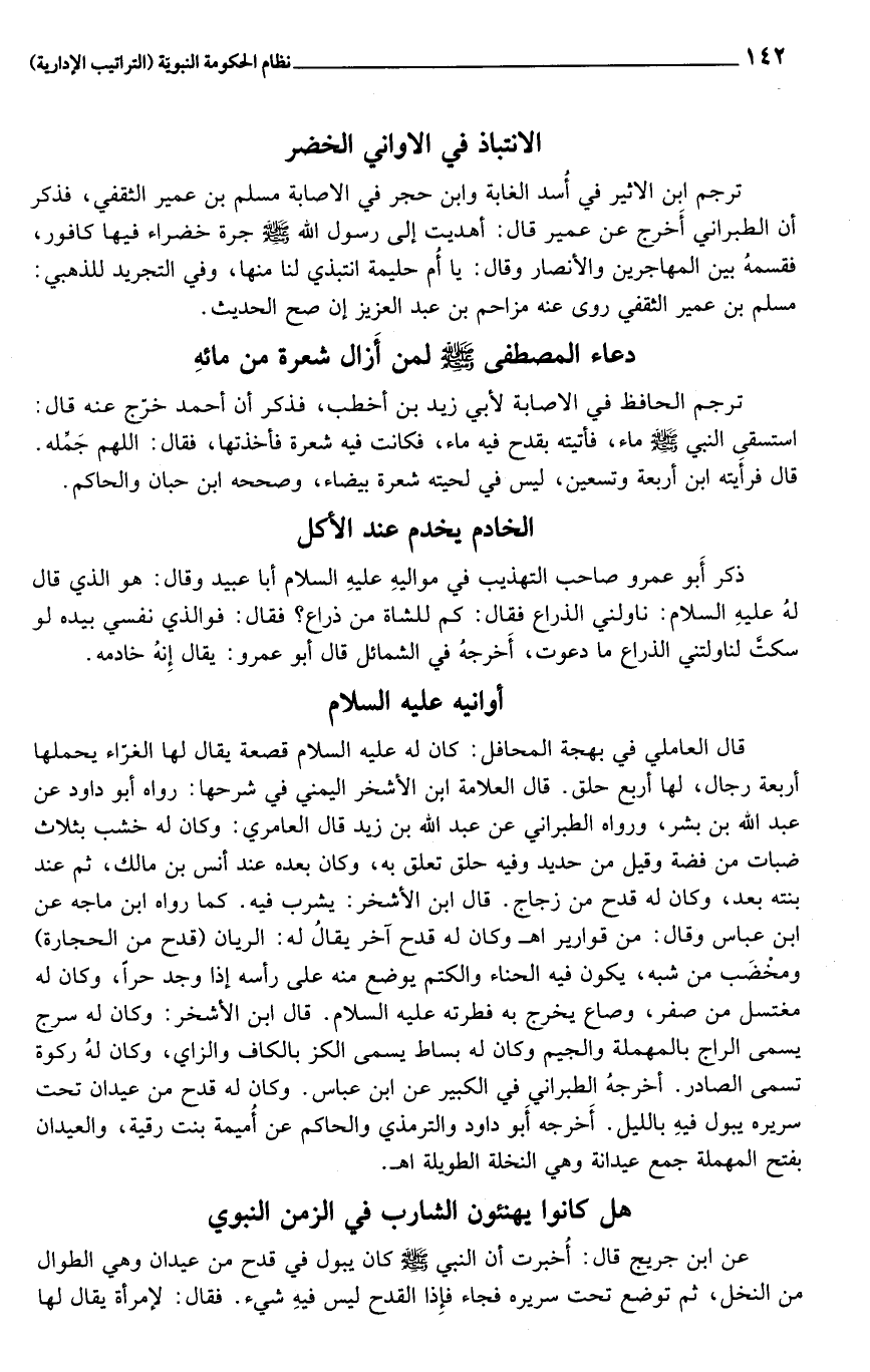 قال العاملي في بهجة المحافل: كان له عليه السلام قصعة يقال لها الغرّاء يحملها أربعة رجال، لها أربع حلق. قال العلامة ابن الأشخر اليمني في شرحها: رواه أبو داود عن عبد الله بن بشر، ورواه الطبراني عن عبد الله بن زيد قال العامري: وكان له خشب بثلاث ضبات من فضة وقيل من حديد وفيه حلق تعلق به، وكان بعده عند أنس بن مالك، ثم عند بنته بعد، وكان له قدح من زجاج. قال ابن الأشخر: يشرب فيه. كما رواه ابن ماجه عن ابن عباس وقال: من قوارير اهـ وكان له قدح آخر يقال له: الريان (قدح من الحجارة) ومخضب من شبه، يكون فيه الحناء والكتم يوضع منه على رأسه إذا وجد حرا، وكان له مغتسل من صفر، وصاع يخرج به فطرته عليه السلام. قال ابن الأشخر: وكان له سرج يسمى الراج بالمهملة والجيم وكان له بساط يسمى الكز بالكاف والزاي، وكان له ركوة تسمى الصادر. أخرجه الطبراني في الكبير عن ابن عباس. وكان له قدح من عيدان تحت سريره يبول فيه بالليل. أخرجه أبو داود والترمذي والحاكم عن أميمة بنت رقية، والعيدان بفتح المهملة جمع عيدانة وهي النخلة الطويلة اهـ.