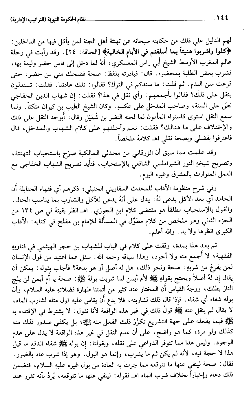 كُلُوا وَاشْرَبُوا هَنِيئاً بِما أَسْلَفْتُمْ فِي الْأَيَّامِ الْخالِيَةِ [الحاقة: 24] . وقد رأيت في رحلة عالم المغرب الأوسط الشيخ أبي راس المعسكري، أنه لما دخل إلى فاس حضر وليمة بها، فشرب بعض الطلبة بمحضره. قال: فبادرته بلفظ: صحة فضحك مني من حضر، حتى قرعت سن الندم. ثم قلت: ما سندكم في الترك؟ فقالوا: تلك عادتنا. فقلت: تستدلون بنقل على ذلك؟ فقالوا بأجمعهم: وأي نقل في هذا؟ فقلت: إن شهاب الدين الخفاجي نصّ على السنة، وصاحب المدخل على عكسه. وكان الشيخ الطيب بن كيران متكئا. ولما سمع النقل استوى كاستواء المأمون لما لحنه النضر بن شميل وقال: أيوجد النقل على ذلك والإختلاف على ما هنالك؟ فقلت: نعم وأحلتهم على كلام الشهاب والمدخل، قال فاعترفوا بفضلي وبصحة نقلي اهـ كلامه ملخصا.
