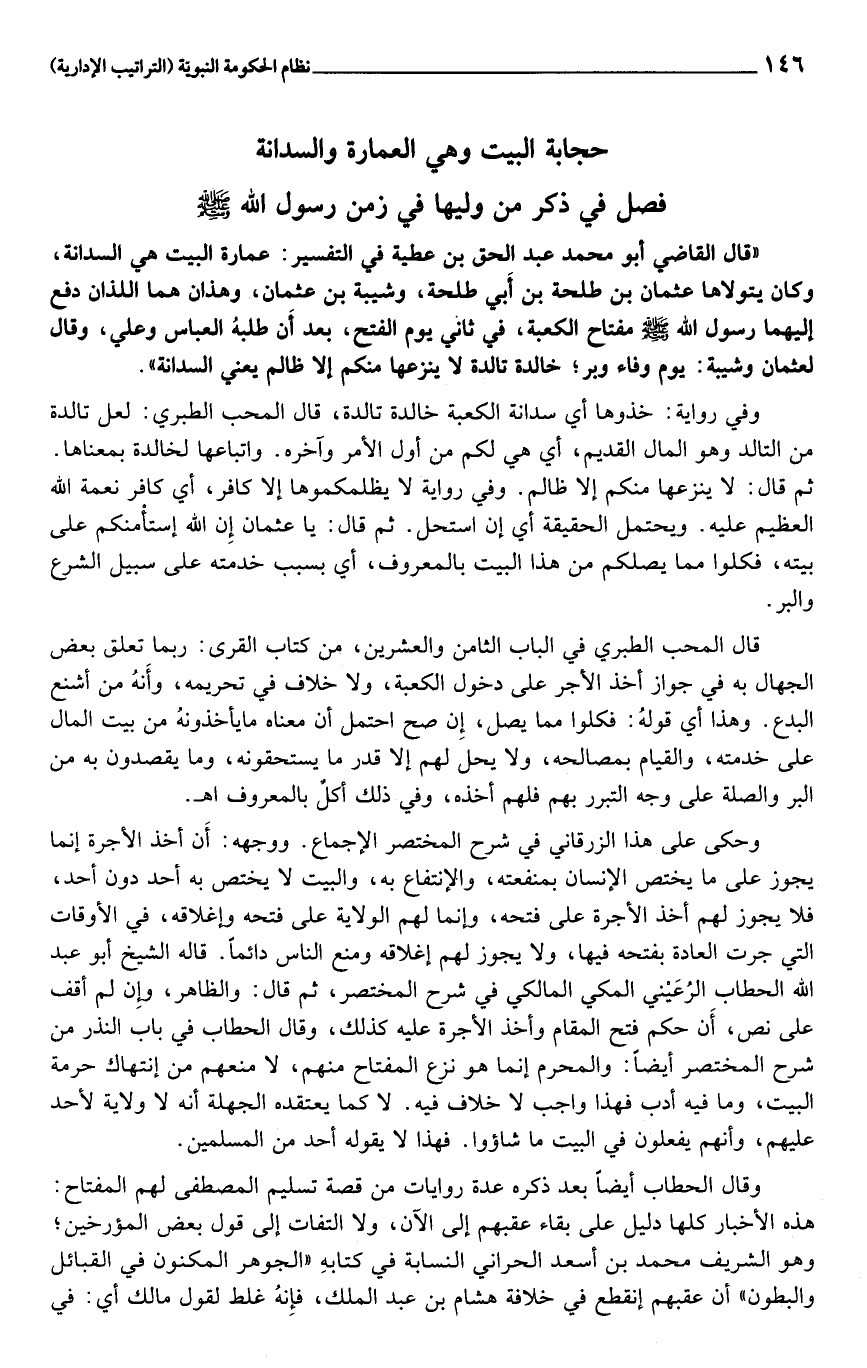 «قال القاضي أبو محمد عبد الحق بن عطية في التفسير: عمارة البيت هي السدانة، وكان يتولاها عثمان بن طلحة بن أبي طلحة، وشيبة بن عثمان، وهذان هما اللذان دفع إليهما رسول الله صلى الله عليه وسلم مفتاح الكعبة، في ثاني يوم الفتح، بعد أن طلبه العباس وعلي، وقال لعثمان وشيبة: يوم وفاء وبر؛ خالدة تالدة لا ينزعها منكم إلا ظالم يعني السدانة» .