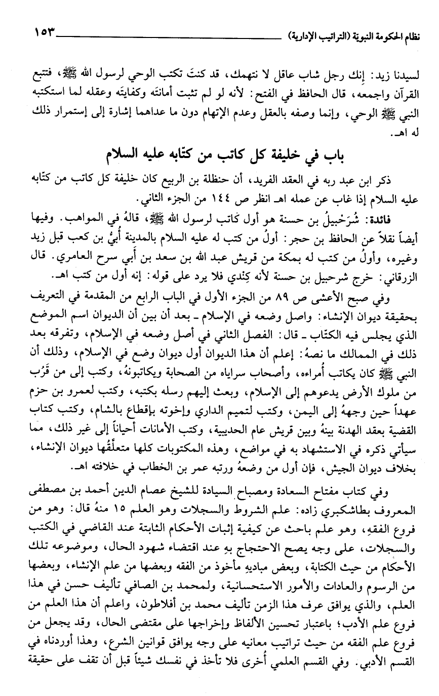 وفي صبح الأعشى ص 89 من الجزء الأول في الباب الرابع من المقدمة في التعريف بحقيقة ديوان الإنشاء: واصل وضعه في الإسلام- بعد أن بين أن الديوان اسم الموضع الذي يجلس فيه الكتّاب- قال: الفصل الثاني في أصل وضعه في الإسلام، وتفرقه بعد ذلك في الممالك ما نصه: إعلم أن هذا الديوان أول ديوان وضع في الإسلام، وذلك أن النبي صلى الله عليه وسلم كان يكاتب أمراءه، وأصحاب سراياه من الصحابة ويكاتبونه، وكتب إلى من قرب من ملوك الأرض يدعوهم إلى الإسلام، وبعث إليهم رسله بكتبه، وكتب لعمرو بن حزم عهدا حين وجهه إلى اليمن، وكتب لتميم الداري وإخوته بإقطاع بالشام، وكتب كتاب القضية بعقد الهدنة بينه وبين قريش عام الحديبية، وكتب الأمانات أحيانا إلى غير ذلك، مما سيأتي ذكره في الاستشهاد به في مواضع، وهذه المكتوبات كلها متعلّقها ديوان الإنشاء، بخلاف ديوان الجيش، فإن أول من وضعه ورتبه عمر بن الخطاب في خلافته اهـ.