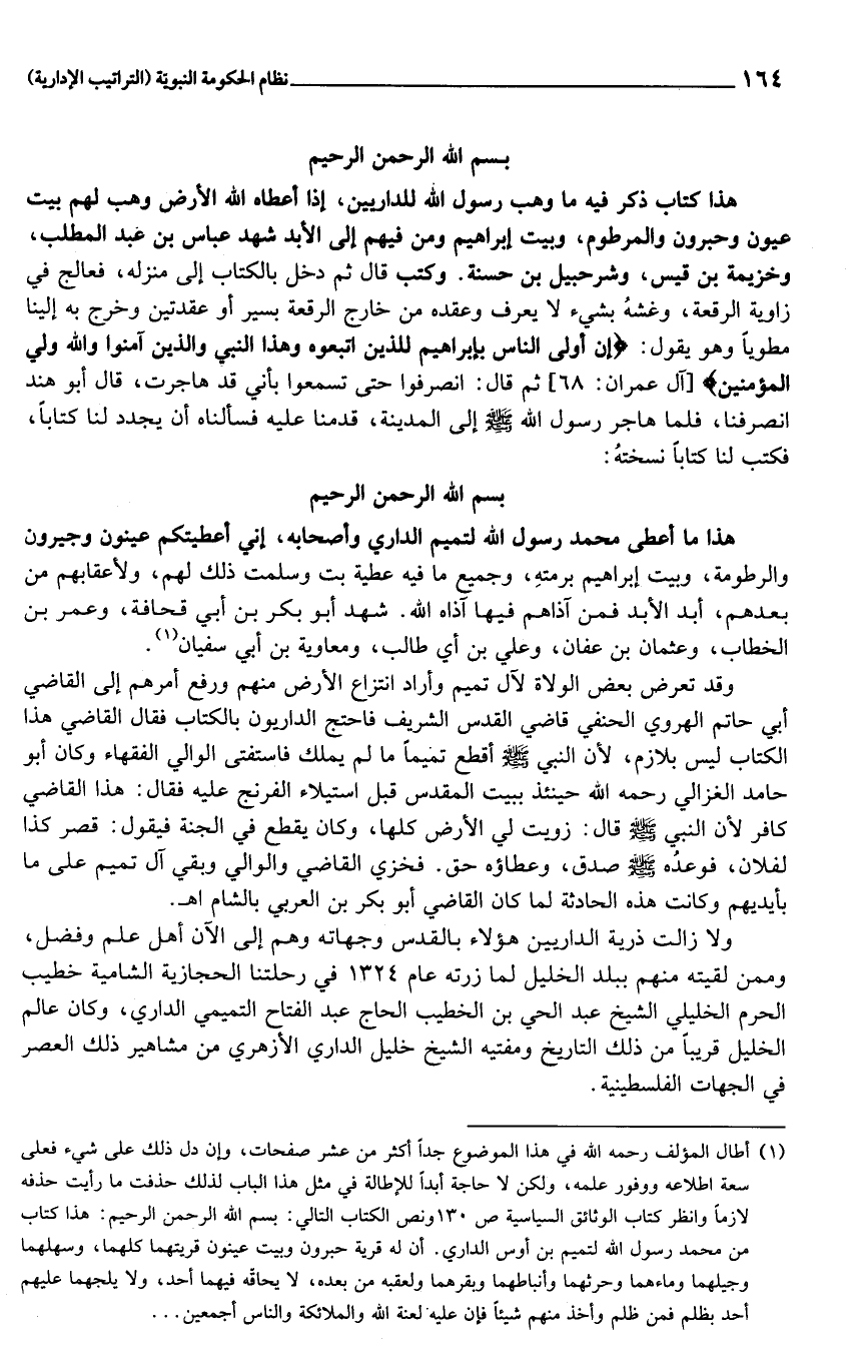 (1) أطال المؤلف رحمه الله في هذا الموضوع جدا أكثر من عشر صفحات، وإن دل ذلك على شيء فعلى سعة اطلاعه ووفور علمه، ولكن لا حاجة أبدا للإطالة في مثل هذا الباب لذلك حذفت ما رأيت حذفه لازما وانظر كتاب الوثائق السياسية ص 130 ونص الكتاب التالي: بسم الله الرحمن الرحيم: هذا كتاب من محمد رسول الله لتميم بن أوس الداري. أن له قرية حبرون وبيت عينون قريتهما كلهما، وسهلهما وجيلهما وماءهما وحرثهما وأنباطهما وبقرهما ولعقبه من بعده، لا يحاقّه فيهما أحد، ولا يلجهما عليهم أحد بظلم فمن ظلم وأخذ منهم شيئا فإن عليه لعنة الله والملائكة والناس أجمعين ...