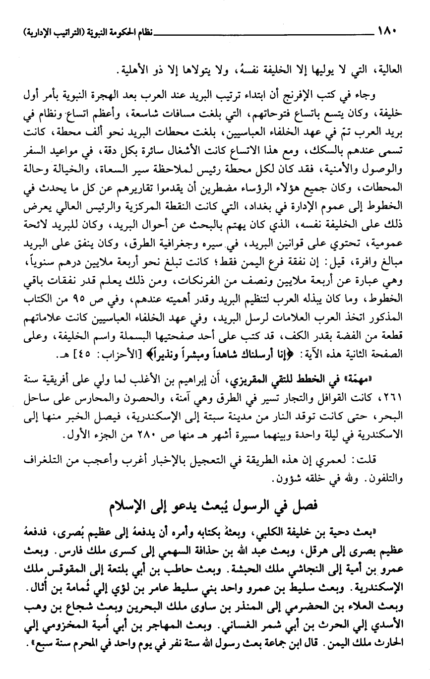 وجاء في كتب الإفرنج أن ابتداء ترتيب البريد عند العرب بعد الهجرة النبوية بأمر أول خليفة، وكان يتسع باتساع فتوحاتهم، التي بلغت مسافات شاسعة، وأعظم اتساع ونظام في بريد العرب تمّ في عهد الخلفاء العباسيين، بلغت محطات البريد نحو ألف محطة، كانت تسمى عندهم بالسكك، ومع هذا الاتساع كانت الأشغال سائرة بكل دقة، في مواعيد السفر والوصول والأمنية، فقد كان لكل محطة رئيس لملاحظة سير السعاة، والخيالة وحالة المحطات، وكان جميع هؤلاء الرؤساء مضطرين أن يقدموا تقاريرهم عن كل ما يحدث في الخطوط إلى عموم الإدارة في بغداد، التي كانت النقطة المركزية والرئيس العالي يعرض ذلك على الخليفة نفسه، الذي كان يهتم بالبحث عن أحوال البريد، وكان للبريد لائحة عمومية، تحتوي على قوانين البريد، في سيره وجغرافية الطرق، وكان ينفق على البريد مبالغ وافرة، قيل: إن نفقة فرع اليمن فقط؛ كانت تبلغ نحو أربعة ملايين درهم سنويا، وهي عبارة عن أربعة ملايين ونصف من الفرنكات، ومن ذلك يعلم قدر نفقات باقي الخطوط، وما كان يبذله العرب لتنظيم البريد وقدر أهميته عندهم، وفي ص 95 من الكتاب المذكور اتخذ العرب العلامات لرسل البريد، وفي عهد الخلفاء العباسيين كانت علاماتهم قطعة من الفضة بقدر الكف، قد كتب على أحد صفحتيها البسملة واسم الخليفة، وعلى الصفحة الثانية هذه الآية: إِنَّا أَرْسَلْناكَ شاهِداً وَمُبَشِّراً وَنَذِيراً [الأحزاب: 45] هـ.