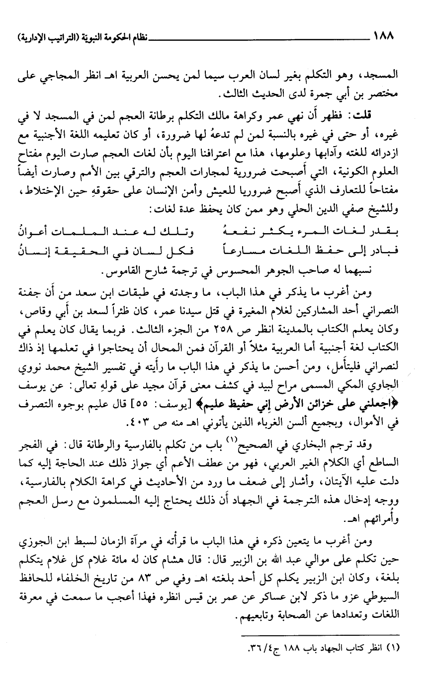 ومن أغرب ما يذكر في هذا الباب، ما وجدته في طبقات ابن سعد من أن جفنة النصراني أحد المشاركين لغلام المغيرة في قتل سيدنا عمر، كان ظئرا لسعد بن أبي وقاص، وكان يعلم الكتاب بالمدينة انظر ص 258 من الجزء الثالث. فربما يقال كان يعلم في الكتاب لغة أجنبية أما العربية مثلا أو القرآن فمن المحال أن يحتاجوا في تعلمها إذ ذاك لنصراني فليتأمل، ومن أحسن ما يذكر في هذا الباب ما رأيته في تفسير الشيخ محمد نووي الجاوي المكي المسمى مراح لبيد في كشف معنى قرآن مجيد على قوله تعالى: عن يوسف اجْعَلْنِي عَلى خَزائِنِ الْأَرْضِ إِنِّي حَفِيظٌ عَلِيمٌ [يوسف: 55] قال عليم بوجوه التصرف في الأموال، وبجميع ألسن الغرباء الذين يأتوني اهـ منه ص 403.