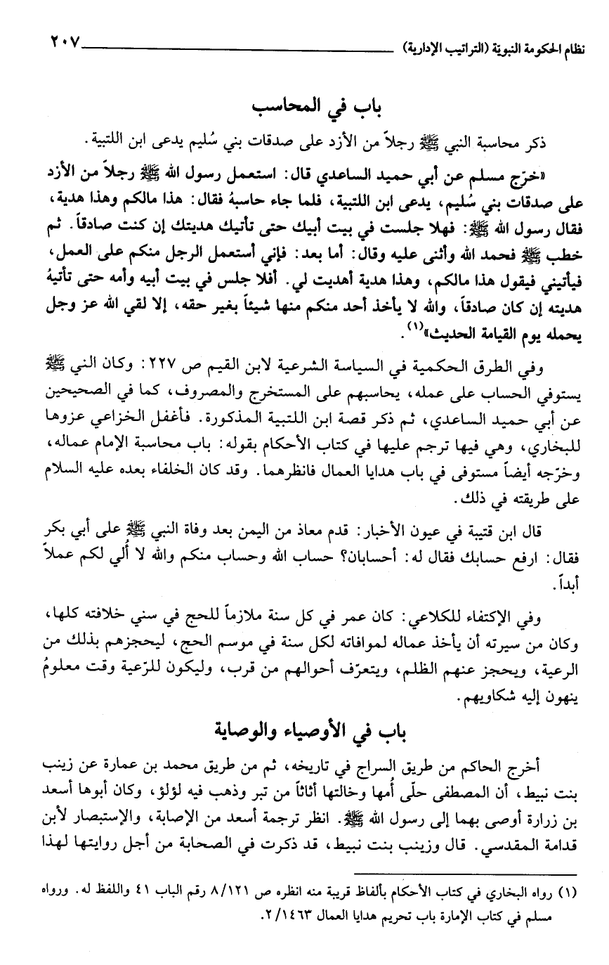 (1) رواه البخاري في كتاب الأحكام بألفاظ قريبة منه انظره ص 121/ 8 رقم الباب 41 واللفظ له. ورواه مسلم في كتاب الإمارة باب تحريم هدايا العمال 1463/ 2.