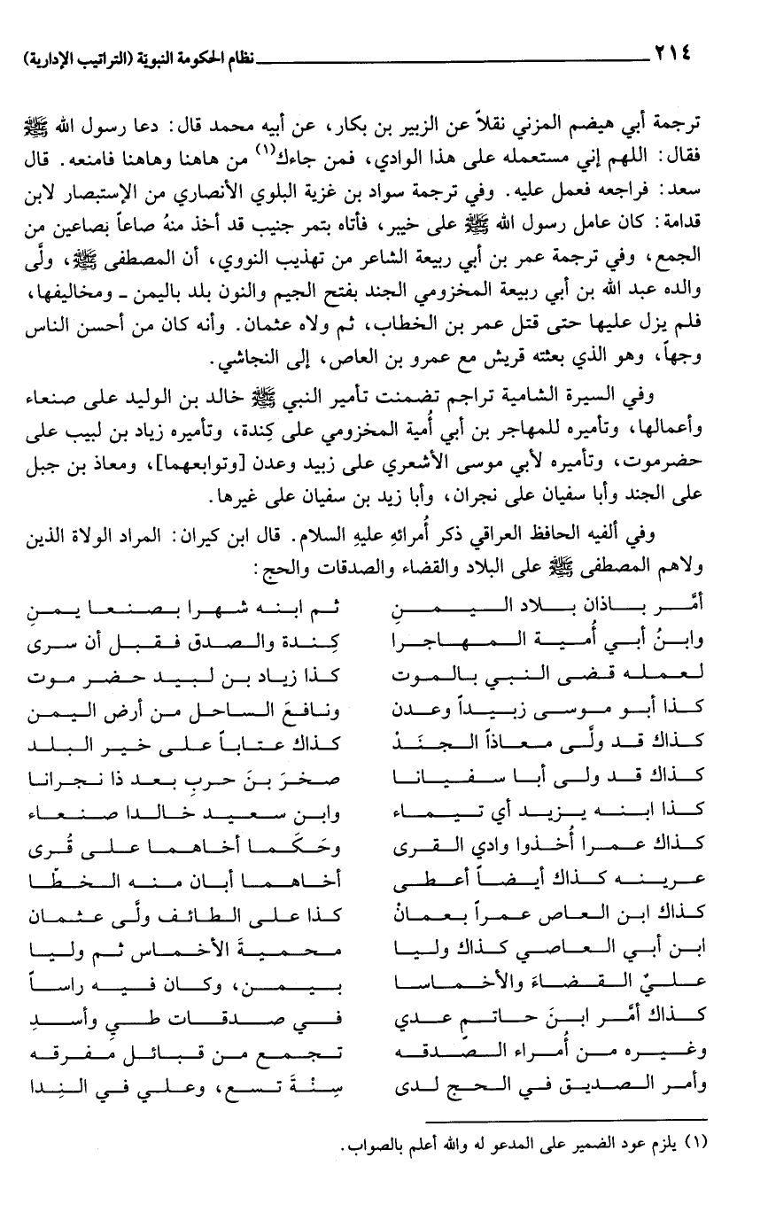 وفي ألفيه الحافظ العراقي ذكر أمرائه عليه السلام. قال ابن كيران: المراد الولاة الذين ولا هم المصطفى صلى الله عليه وسلم على البلاد والقضاء والصدقات والحج: