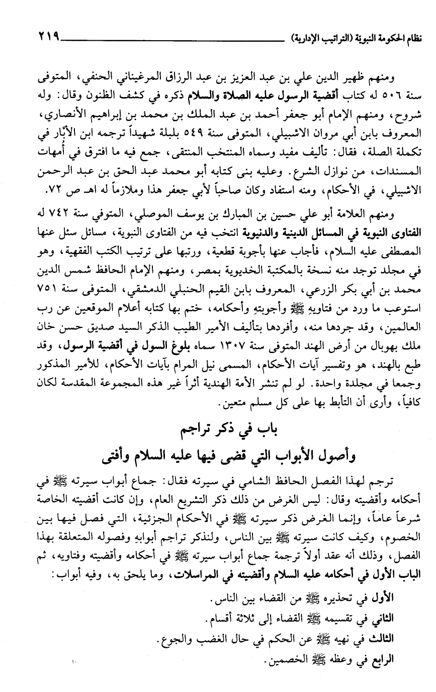 ومنهم العلامة أبو علي حسين بن المبارك بن يوسف الموصلي، المتوفي سنة 742 له الفتاوى النبوية في المسائل الدينية والدنيوية انتخب فيه من الفتاوى النبوية، مسائل سئل عنها المصطفى عليه السلام، فأجاب عنها بأجوبة قطعية، ورتبها على ترتيب الكتب الفقهية، وهو في مجلد توجد منه نسخة بالمكتبة الخديوية بمصر، ومنهم الإمام الحافظ شمس الدين محمد بن أبي بكر الزرعي، المعروف بابن القيم الحنبلي الدمشقي، المتوفى سنة 751 استوعب ما ورد من فتاويه صلى الله عليه وسلم وأجوبته وأحكامه، ختم بها كتابه أعلام الموقعين عن رب العالمين، وقد جردها منه، وأفردها بتأليف الأمير الطيب الذكر السيد صديق حسن خان ملك بهوبال من أرض الهند المتوفى سنة 1307 سماه بلوغ السول في أقضية الرسول، وقد طبع بالهند، هو وتفسير آيات الأحكام، المسمى نيل المرام بايات الأحكام، للأمير المذكور وجمعا في مجلدة واحدة. لو لم تنشر الأمة الهندية أثرا غير هذه المجموعة المقدسة لكان كافيا، وأرى أن التأبط بها على كل مسلم متعين.