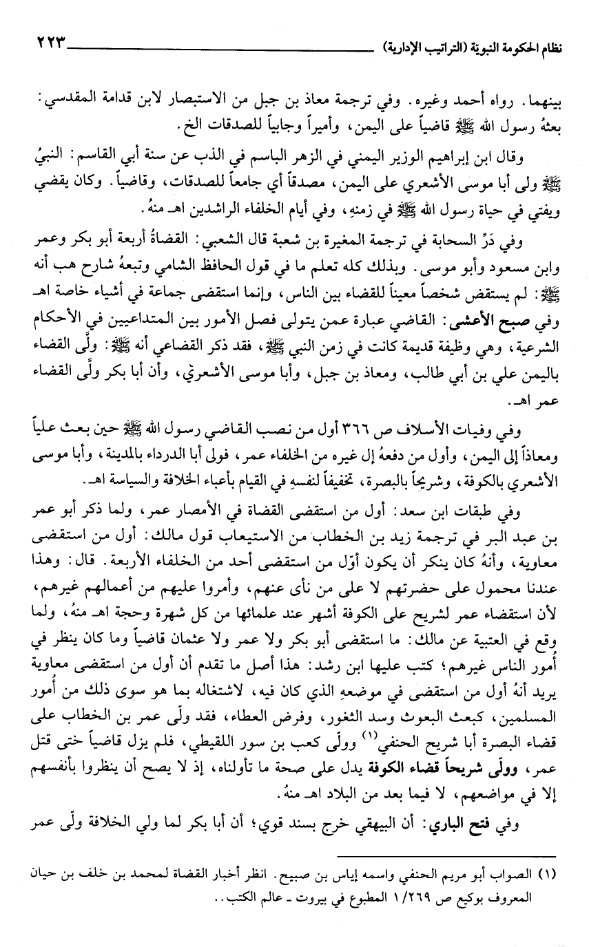 وفي درّ السحابة في ترجمة المغيرة بن شعبة قال الشعبي: القضاة أربعة أبو بكر وعمر وابن مسعود وأبو موسى. وبذلك كله تعلم ما في قول الحافظ الشامي وتبعه شارح هب أنه صلى الله عليه وسلم: لم يستقض شخصا معينا للقضاء بين الناس، وإنما استقضى جماعة في أشياء خاصة اهـ وفي صبح الأعشى: القاضي عبارة عمن يتولى فصل الأمور بين المتداعيين في الأحكام الشرعية، وهي وظيفة قديمة كانت في زمن النبي صلى الله عليه وسلم، فقد ذكر القضاعي أنه صلى الله عليه وسلم: ولّى القضاء باليمن علي بن أبي طالب، ومعاذ بن جبل، وأبا موسى الأشعري، وأن أبا بكر ولّى القضاء عمر اهـ.