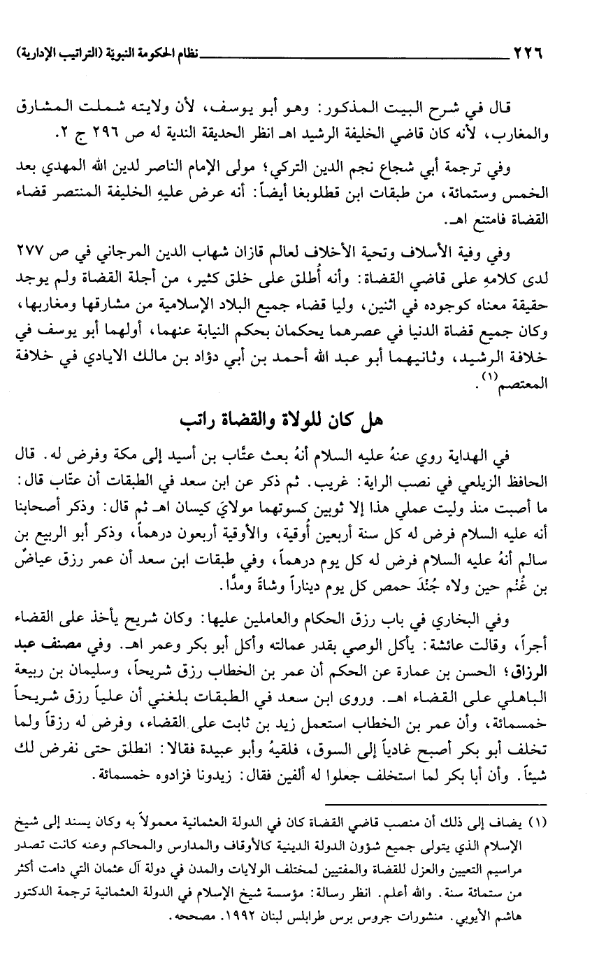 (1) يضاف إلى ذلك أن منصب قاضي القضاة كان في الدولة العثمانية معمولا به وكان يسند إلى شيخ الإسلام الذي يتولى جميع شؤون الدولة الدينية كالأوقاف والمدارس والمحاكم وعنه كانت تصدر مراسيم التعيين والعزل للقضاة والمفتيين لمختلف الولايات والمدن في دولة آل عثمان التي دامت أكثر من ستمائة سنة. والله أعلم. انظر رسالة: مؤسسة شيخ الإسلام في الدولة العثمانية ترجمة الدكتور هاشم الأيوبي. منشورات جروس برس طرابلس لبنان 1992. مصححه.