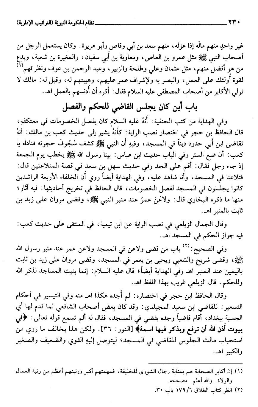 وقال الحافظ ابن حجر في اختصاره: لم أجده هكذا اهـ منه وفي التيسير في أحكام التسعير: للقاضي ابن سعيد المجيلدي: وقد كان بعض أصحاب الشافعي لما قدم لها أي الحسبة ببغداد، أقام قاضيا وجده يقضي في المسجد، فقال له ألم تسمع قوله تعالى: فِي بُيُوتٍ أَذِنَ اللَّهُ أَنْ تُرْفَعَ وَيُذْكَرَ فِيهَا اسْمُهُ [النور: 36] . ولكن هذا يخالف ما روي من استحباب مالك الجلوس للقاضي في المسجد؛ ليتوصل إليه القوي والضعيف والصغير والكبير اهـ.