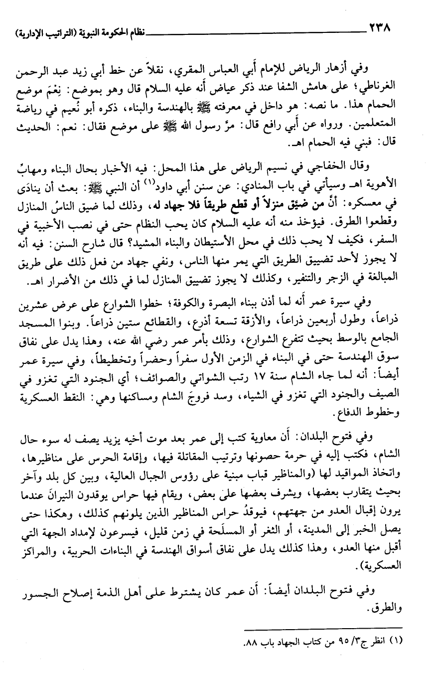 وقال الخفاجي في نسيم الرياض على هذا المحل: فيه الأخبار بحال البناء ومهابّ الأهوية اهـ وسيأتي في باب المنادي: عن سنن أبي داود «1» أن النبي صلى الله عليه وسلم: بعث أن ينادى في معسكره: أنّ من ضيّق منزلا أو قطع طريقا فلا جهاد له، وذلك لما ضيق الناس المنازل وقطعوا الطرق. فيؤخذ منه أنه عليه السلام كان يحب النظام حتى في نصب الأخبية في السفر، فكيف لا يحب ذلك في محل الأستيطان والبناء المشيد؟ قال شارح السنن: فيه أنه لا يجوز لأحد تضييق الطريق التي يمر منها الناس، ونفي جهاد من فعل ذلك على طريق المبالغة في الزجر والتنفير، وكذلك لا يجوز تضييق المنازل لما في ذلك من الأضرار اهـ.