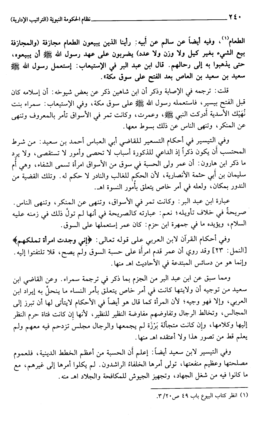 صريحة في خلاف تأويله؛ نعم: عبارته كالصريحة في أنها لم تولّ ذلك في زمنه عليه السلام، ويؤيده ما في جمهرة ابن حزم: كان عمر إستعملها على السوق.