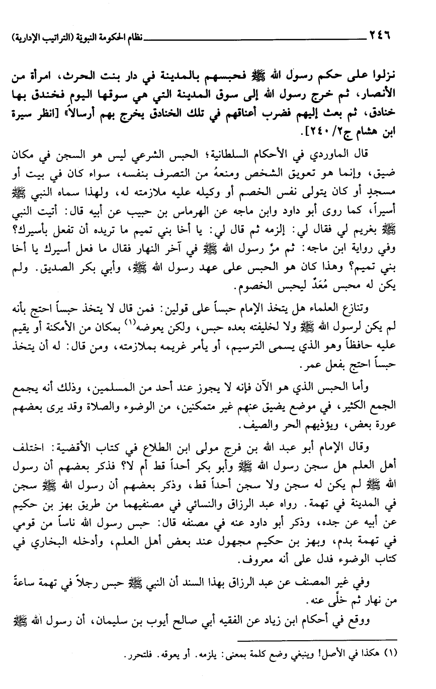 وفي رواية ابن ماجه: ثم مرّ رسول الله صلى الله عليه وسلم في آخر النهار فقال ما فعل أسيرك يا أخا بني تميم؟ وهذا كان هو الحبس على عهد رسول الله صلى الله عليه وسلم، وأبي بكر الصديق. ولم يكن له محبس معد ليحبس الخصوم.