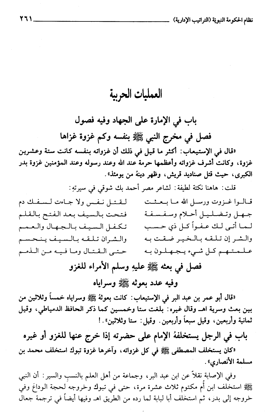 «قال في الإستيعاب: أكثر ما قيل في ذلك أن غزواته بنفسه كانت ستة وعشرين غزوة، وكانت أشرف غزواته وأعظمها حرمة عند الله وعند رسوله وعند المؤمنين غزوة بدر الكبرى، حيث قتل صناديد قريش، وظهر دينه من يومئذ» .
