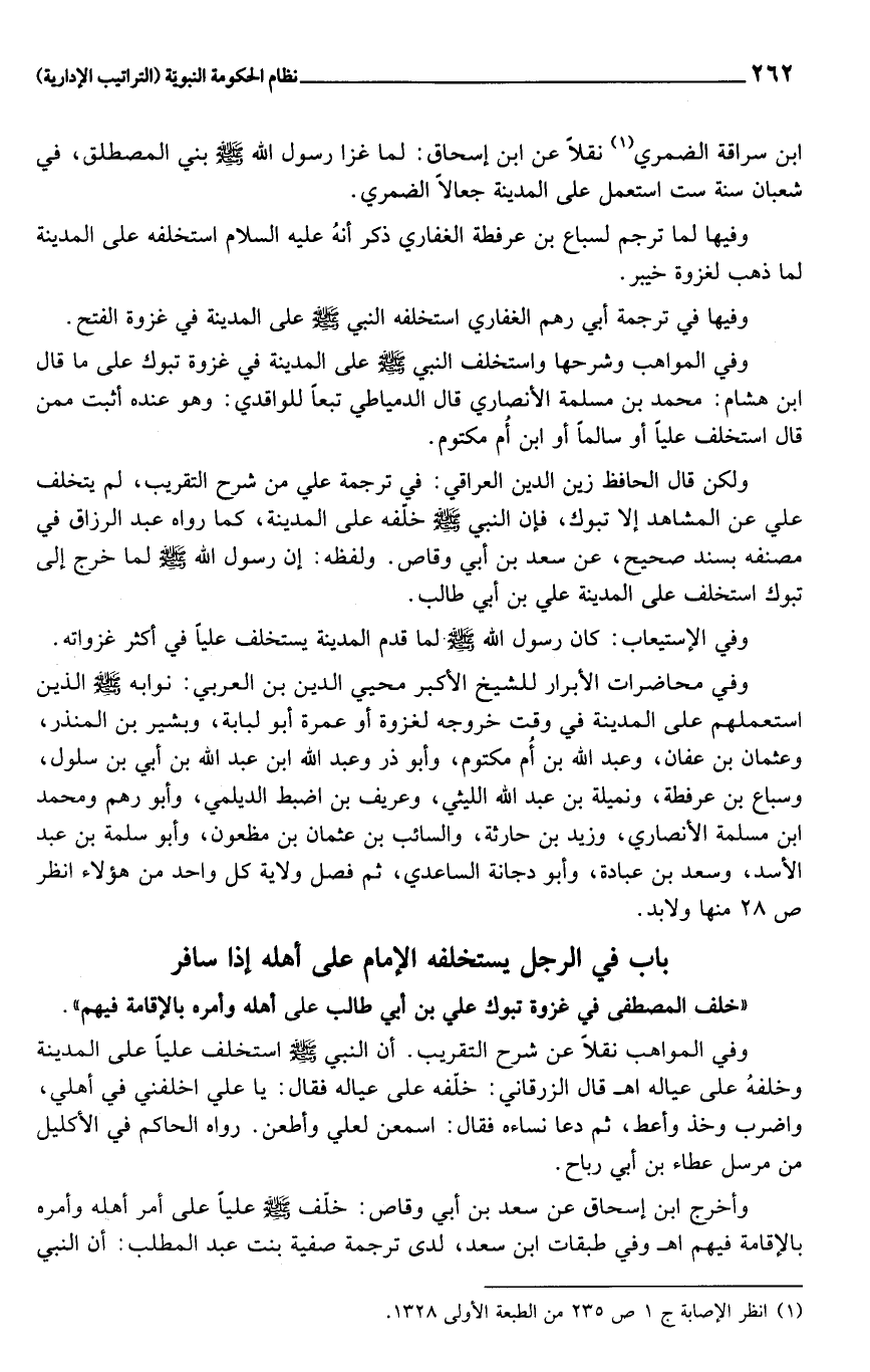 وأخرج ابن إسحاق عن سعد بن أبي وقاص: خلّف صلى الله عليه وسلم عليا على أمر أهله وأمره بالإقامة فيهم اهـ وفي طبقات ابن سعد، لدى ترجمة صفية بنت عبد المطلب: أن النبي