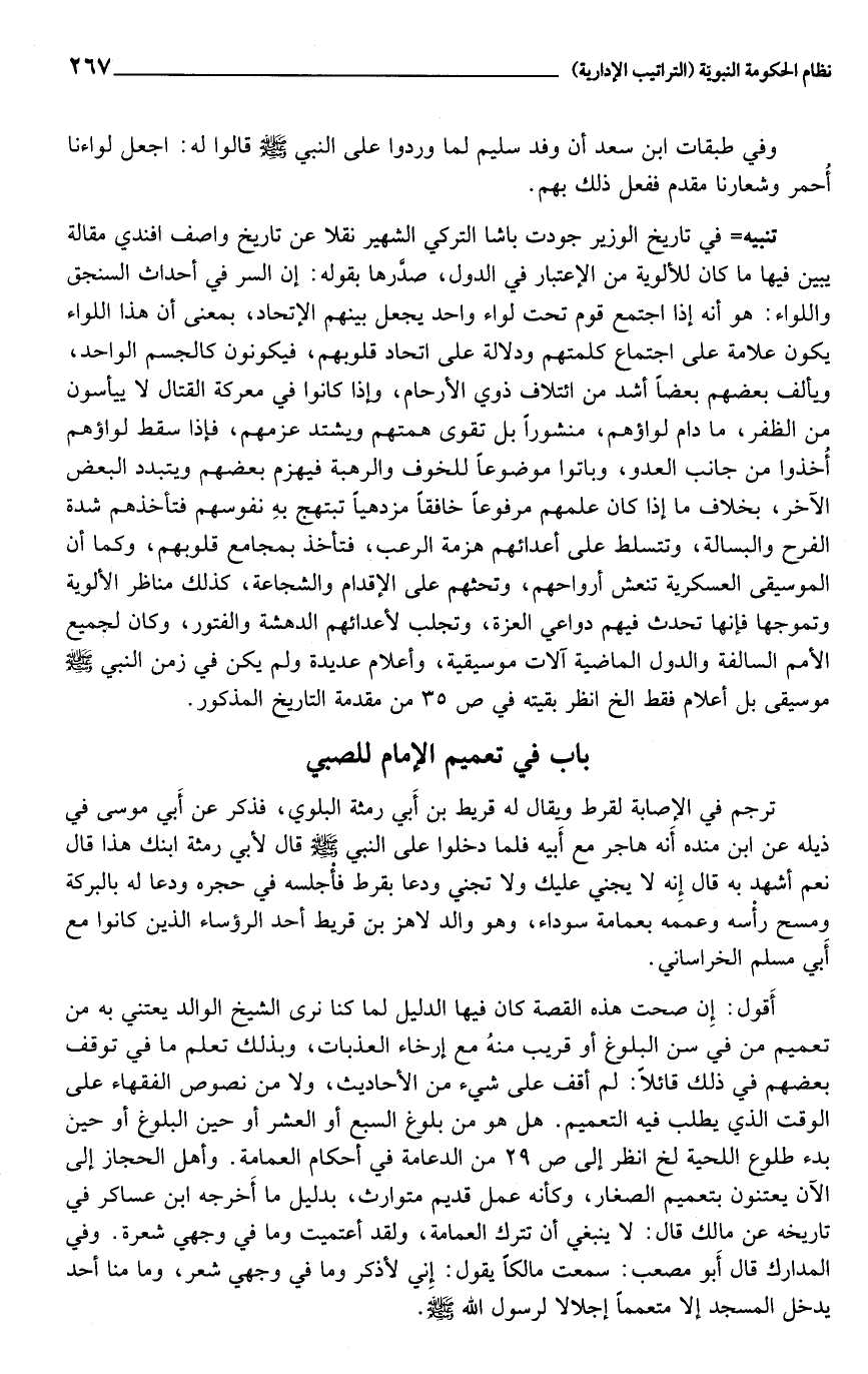 أقول: إن صحت هذه القصة كان فيها الدليل لما كنا نرى الشيخ الوالد يعتني به من تعميم من في سن البلوغ أو قريب منه مع إرخاء العذبات، وبذلك تعلم ما في توقف بعضهم في ذلك قائلا: لم أقف على شيء من الأحاديث، ولا من نصوص الفقهاء على الوقت الذي يطلب فيه التعميم. هل هو من بلوغ السبع أو العشر أو حين البلوغ أو حين بدء طلوع اللحية لخ انظر إلى ص 29 من الدعامة في أحكام العمامة. وأهل الحجاز إلى الآن يعتنون بتعميم الصغار، وكأنه عمل قديم متوارث، بدليل ما أخرجه ابن عساكر في تاريخه عن مالك قال: لا ينبغي أن تترك العمامة، ولقد أعتميت وما في وجهي شعرة. وفي المدارك قال أبو مصعب: سمعت مالكا يقول: إني لأذكر وما في وجهي شعر، وما منا أحد يدخل المسجد إلا متعمما إجلالا لرسول الله صلى الله عليه وسلم.