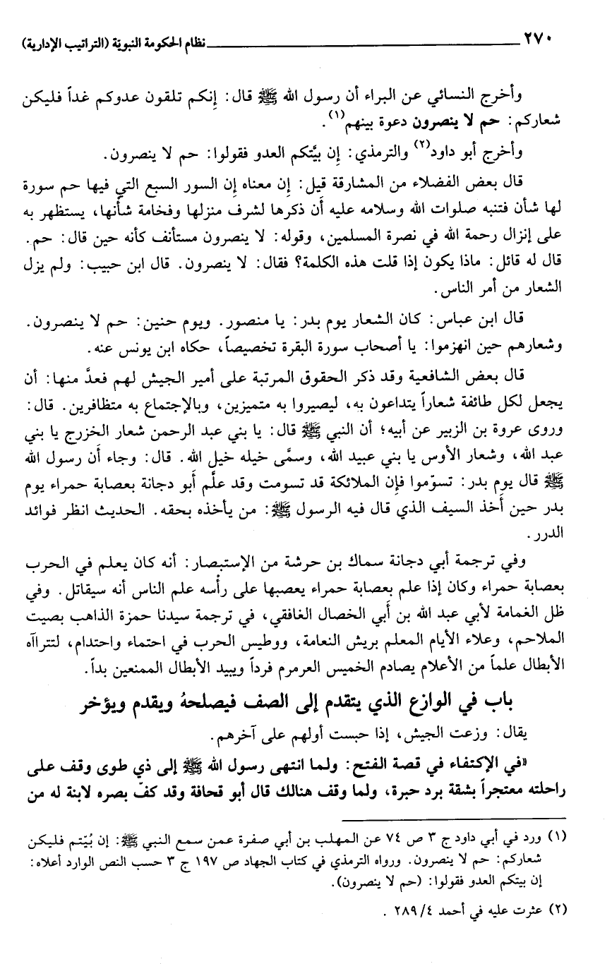 (1) ورد في أبي داود ج 3 ص 74 عن المهلب بن أبي صفرة عمن سمع النبي صلى الله عليه وسلم: إن بيّتم فليكن شعاركم: حم لا ينصرون. ورواه الترمذي في كتاب الجهاد ص 197 ج 3 حسب النص الوارد أعلاه: إن بيتكم العدو فقولوا: (حم لا ينصرون) .