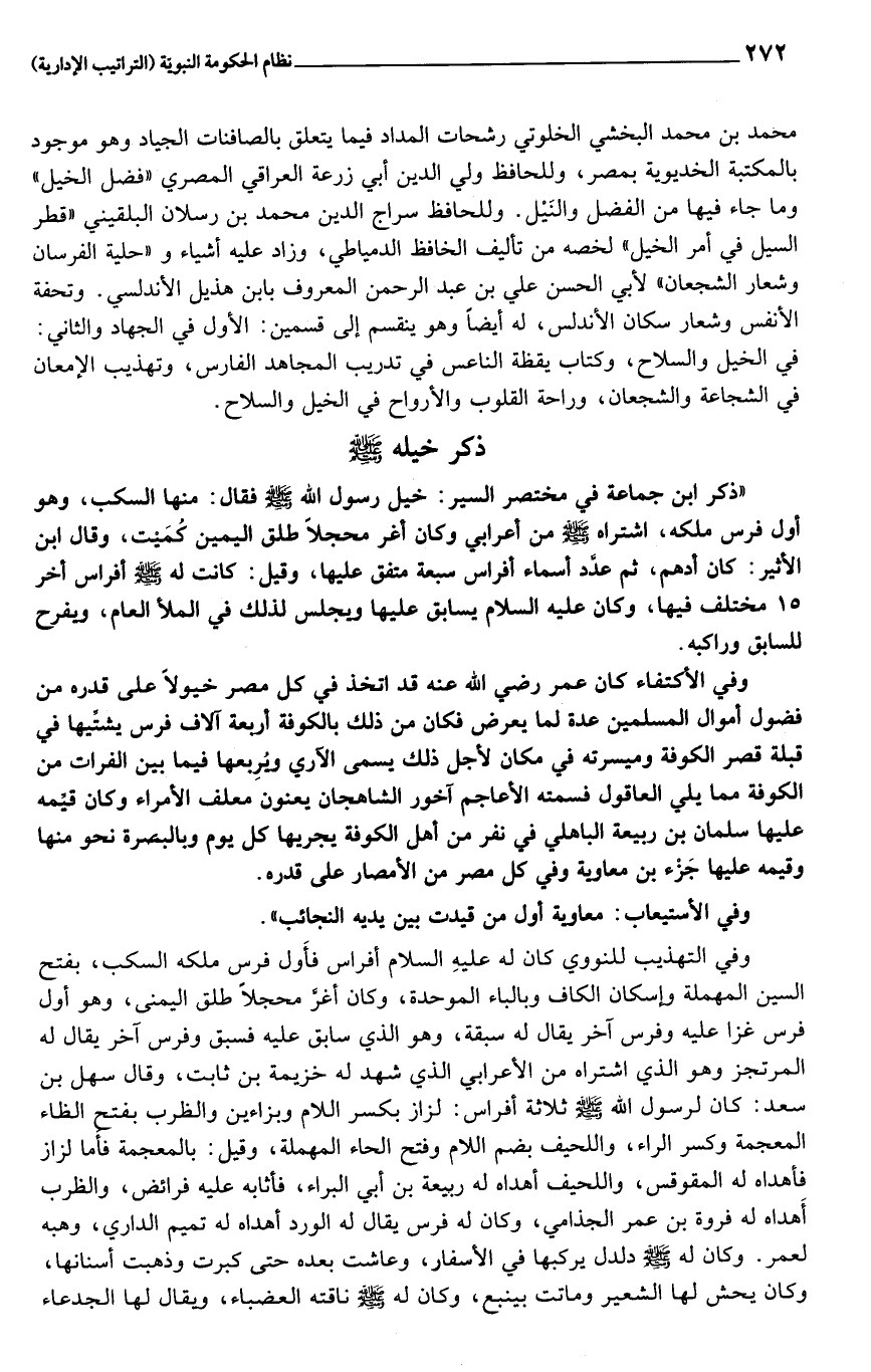 محمد بن محمد البخشي الخلوتي رشحات المداد فيما يتعلق بالصافنات الجياد وهو موجود بالمكتبة الخديوية بمصر، وللحافظ ولي الدين أبي زرعة العراقي المصري «فضل الخيل» وما جاء فيها من الفضل والنيل. وللحافظ سراج الدين محمد بن رسلان البلقيني «قطر السيل في أمر الخيل» لخصه من تأليف الخافظ الدمياطي، وزاد عليه أشياء و «حلية الفرسان وشعار الشجعان» لأبي الحسن علي بن عبد الرحمن المعروف بابن هذيل الأندلسي. وتحفة الأنفس وشعار سكان الأندلس، له أيضا وهو ينقسم إلى قسمين: الأول في الجهاد والثاني: