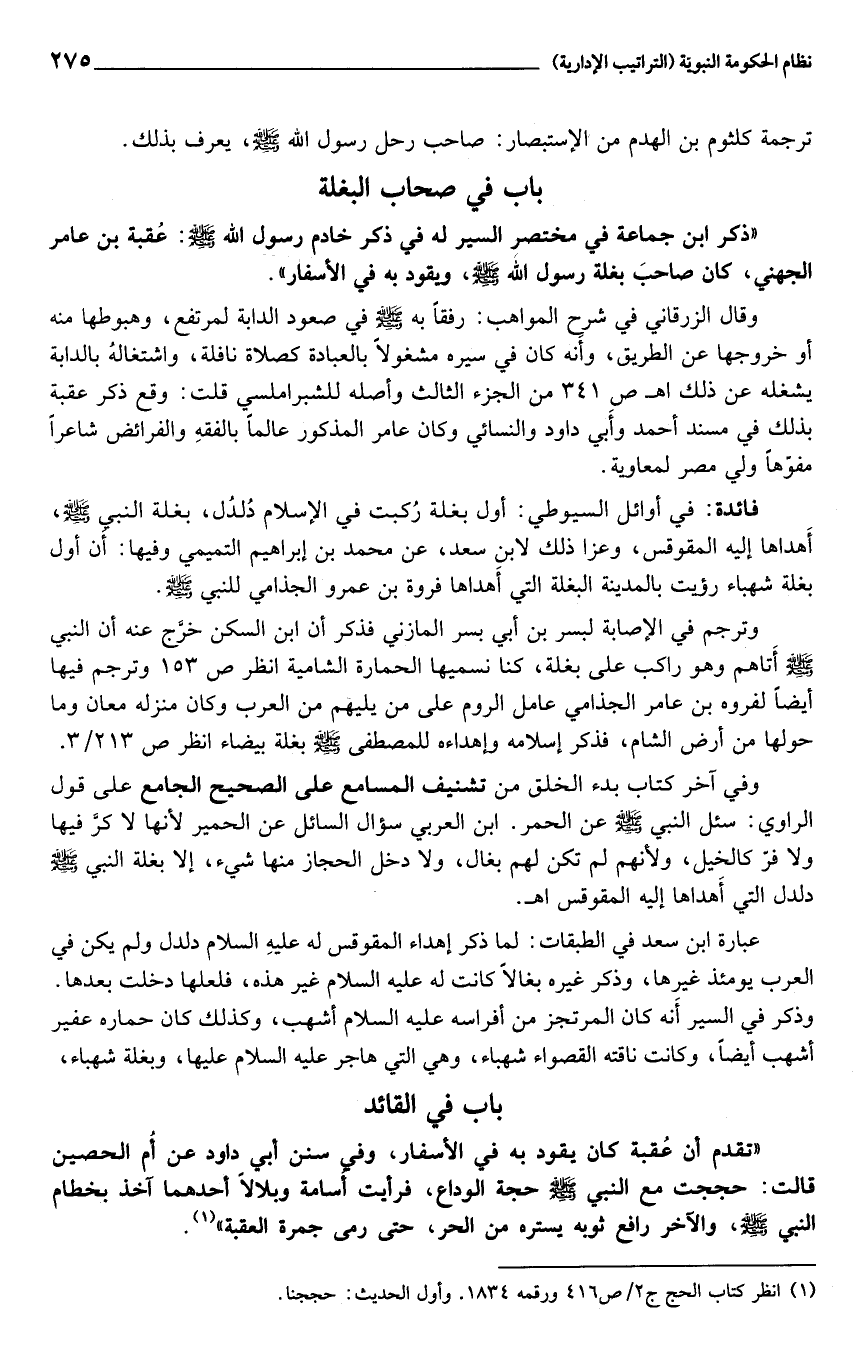 وترجم في الإصابة لبسر بن أبي بسر المازني فذكر أن ابن السكن خرّج عنه أن النبي صلى الله عليه وسلم أتاهم وهو راكب على بغلة، كنا نسميها الحمارة الشامية انظر ص 153 وترجم فيها أيضا لفروه بن عامر الجذامي عامل الروم على من يليهم من العرب وكان منزله معان وما حولها من أرض الشام، فذكر إسلامه وإهداءه للمصطفى صلى الله عليه وسلم بغلة بيضاء انظر ص 213/ 3.