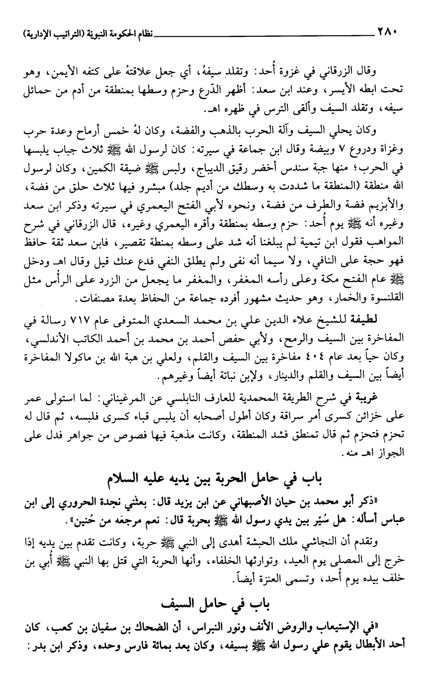 وقال الزرقاني في غزوة أحد: وتقلد سيفه، أي جعل علاقته على كتفه الأيمن، وهو تحت ابطه الأيسر، وعند ابن سعد: أظهر الدّرع وحزم وسطها بمنطقة من أدم من حمائل سيفه، وتقلد السيف وألقى الترس في ظهره اهـ.
