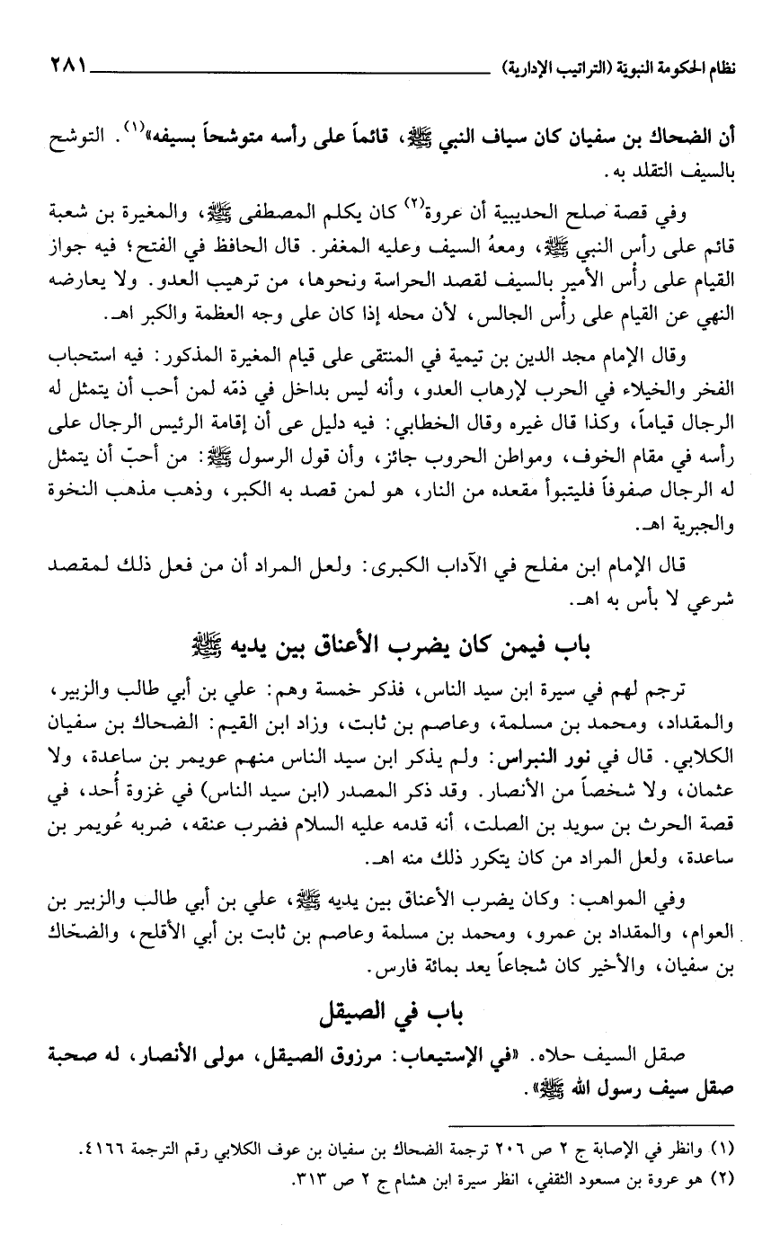 وفي المواهب: وكان يضرب الأعناق بين يديه صلى الله عليه وسلم، علي بن أبي طالب والزبير بن العوام، والمقداد بن عمرو، ومحمد بن مسلمة وعاصم بن ثابت بن أبي الأقلح، والضحّاك بن سفيان، والأخير كان شجاعا يعد بمائة فارس.