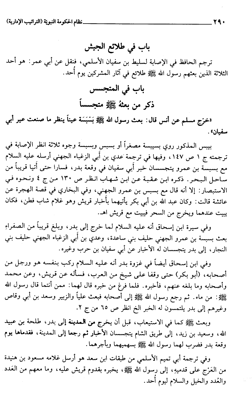 وفي ابن إسحاق أيضا في غزوة بدر أنه عليه السلام ركب بنفسه هو ورجل من أصحابه، (أبو بكر) حتى وقفا على شيخ من العرب، فسأله عن قريش، وعن محمد وأصحابه وما بلغه عنهم، فأخبره. فلما فرغ من خبره قال لهما: ممن أنتما قال رسول الله صلى الله عليه وسلم: من ماء. ثم رجع رسول الله صلى الله عليه وسلم إلى أصحابه فبعث عليا والزبير وسعد بن أبي وقاص وغيرهم إلى بدر يلتمسون له الخبر الخ انظر ص 65 من ج 2.