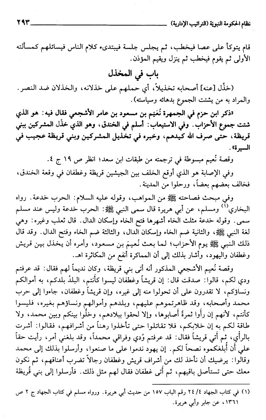 «ذكر ابن حزم في الجمهرة نعيم بن مسعود بن عامر الأشجعي فقال فيه: هو الذي شتت جموع الأحزاب. وفي الاستيعاب: أسلم في الخندق، وهو الذي خذّل المشركين ببني قريظة، حتى صرف الله كيدهم، وخبره في تخذيل المشركين وبني قريظة عجيب في السيرة» .