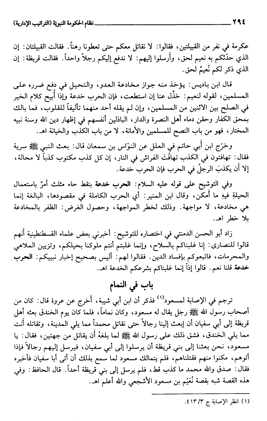 وفي التوشيح على قوله عليه السلام: الحرب خدعة بنقط حاء مثلث أمر باستعمال الحيلة فيه ما أمكن، وقال ابن المنير: أي الحرب الكاملة في مقصودها، البالغة إنما هي مخادعة، لا مواجهة. وذلك لخطر المواجهة، وحصول الغرض: الظفر بالمخادعة بلا خطر اهـ.