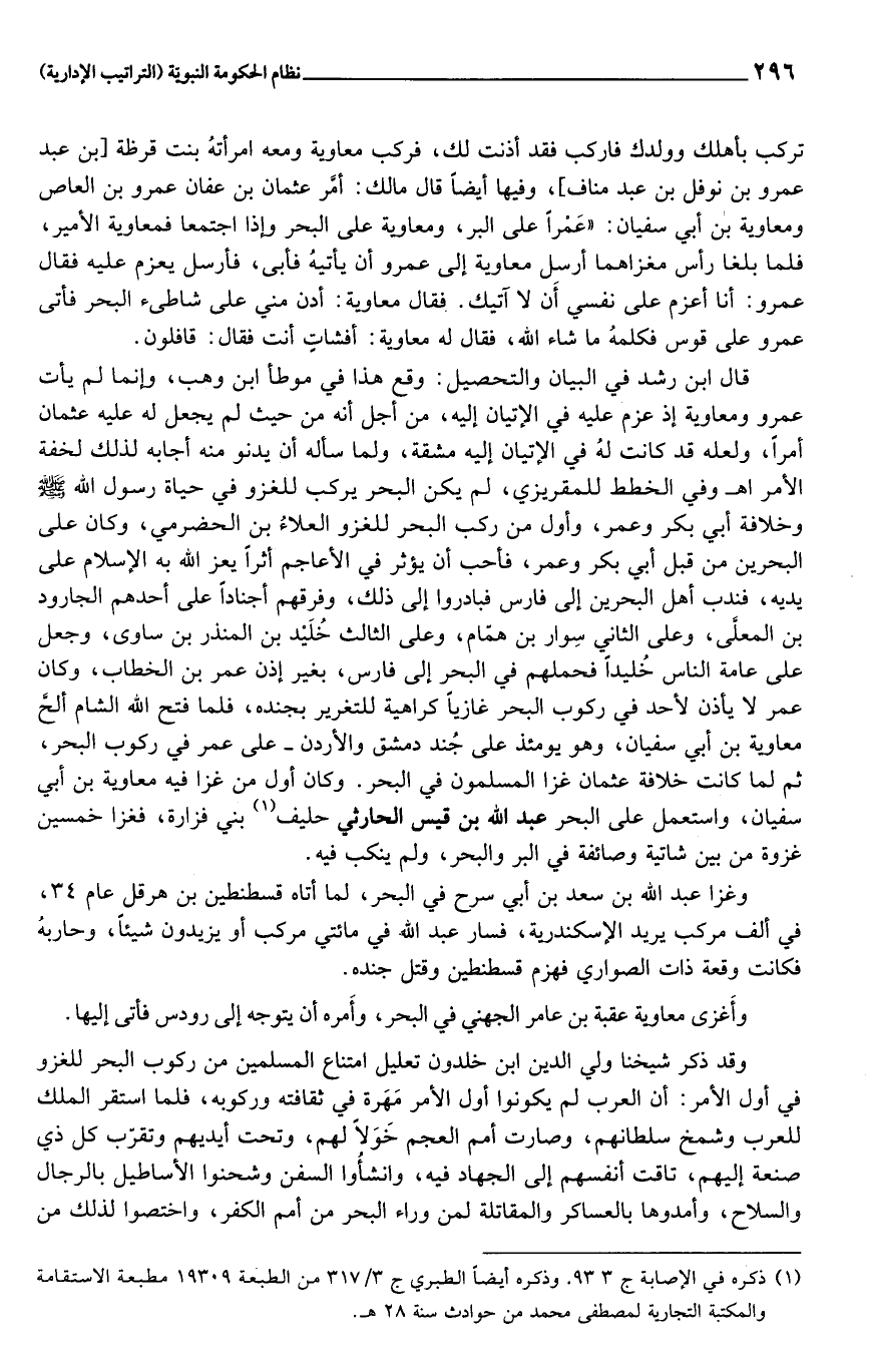 قال ابن رشد في البيان والتحصيل: وقع هذا في موطأ ابن وهب، وإنما لم يأت عمرو ومعاوية إذ عزم عليه في الإتيان إليه، من أجل أنه من حيث لم يجعل له عليه عثمان أمرا، ولعله قد كانت له في الإتيان إليه مشقة، ولما سأله أن يدنو منه أجابه لذلك لخفة الأمر اهـ وفي الخطط للمقريزي، لم يكن البحر يركب للغزو في حياة رسول الله صلى الله عليه وسلم وخلافة أبي بكر وعمر، وأول من ركب البحر للغزو العلاء بن الحضرمي، وكان على البحرين من قبل أبي بكر وعمر، فأحب أن يؤثر في الأعاجم أثرا يعز الله به الإسلام على يديه، فندب أهل البحرين إلى فارس فبادروا إلى ذلك، وفرقهم أجنادا على أحدهم الجارود بن المعلّى، وعلى الثاني سوار بن همّام، وعلى الثالث خليد بن المنذر بن ساوى، وجعل على عامة الناس خليدا فحملهم في البحر إلى فارس، بغير إذن عمر بن الخطاب، وكان عمر لا يأذن لأحد في ركوب البحر غازيا كراهية للتغرير بجنده، فلما فتح الله الشام ألحّ معاوية بن أبي سفيان، وهو يومئذ على جند دمشق والأردن- على عمر في ركوب البحر، ثم لما كانت خلافة عثمان غزا المسلمون في البحر. وكان أول من غزا فيه معاوية بن أبي سفيان، واستعمل على البحر عبد الله بن قيس الحارثي حليف «1» بني فزارة، فغزا خمسين غزوة من بين شاتية وصائفة في البر والبحر، ولم ينكب فيه.
