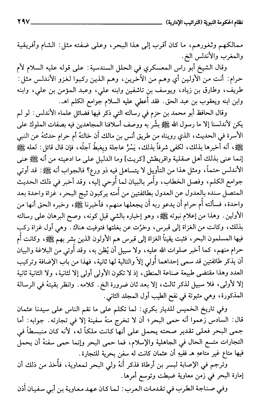 وقال الحافظ أبو محمد بن حزم في رسالته التي ذكر فيها فضائل علماء الأندلس: لو لم يكن لأندلسنا إلا ما رسول الله صلى الله عليه وسلم بشّر به ووصف أسلافنا المجاهدين فيه بصفات الملوك على الأسرة في الحديث، الذي رويناه من طريق أنس بن مالك أن خالته أم حرام حدثته عن النبي صلى الله عليه وسلم، أنه أخبرها بذلك، لكفى شرفا بذلك، يسرّ عاجلة ويغبط آجله، فإن قال قائل: لعله صلى الله عليه وسلم إنما عنى بذلك أهل صقلية واقريطش [كريت] وما الدليل على ما ادعيته من أنه صلى الله عليه وسلم عنى الأندلس حتما، ومثل هذا من التأويل لا يتساهل فيه ذو ورع؟ فالجواب أنه صلى الله عليه وسلم: قد أوتي جوامع الكلم، وفصل الخطاب، وأمر بالبيان لما أوحي إليه، وقد أخبر في ذلك الحديث المتصل سنده بالعدول عن العدول بطائفتين من أمته يركبون ثبج البحر، غزاة واحدة بعد واحدة، فسألته أم حرام أن يدعو ربه أن يجعلها منهم، فأخبرنا صلى الله عليه وسلم، وخبره الحق أنها من الأولين. وهذا من إعلام نبوته صلى الله عليه وسلم، وهو إخباره بالشي قبل كونه، وصح البرهان على رسالته بذلك، وكانت من الغزاة إلى قبرس، وخرّت عن بغلتها فتوفيت هناك. وهي أول غزاة ركب فيها المسلمون البحر، فثبت يقينا الغزاة إلى قبرس هم الأولون الذين بشر بهم صلى الله عليه وسلم، وكانت أم حرام منهم، كما أخبر صلوات الله عليه، ولا سبيل أن يظن به، وقد أوتي من البلاغة والبيان أن يذكر طائفتين قد سمى إحدا هما أولي إلّا والتالية لها ثانية، فهذا من باب الإضافة وتركيب العدد وهذا مقتضى طبيعة صناعة المنطق، إذ لا تكون الأولى أولى إلا لثانية، ولا الثانية ثانية إلا لأولى، فلا سبيل لذكر ثالث، إلا بعد ثان ضرورة الخ. كلامه. وانظر بقيته في الرسالة المذكورة، وهي مثبوته في نفح الطيب أول المجلد الثاني.