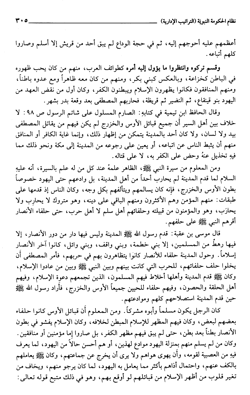 ومن المعلوم من سيرة النبي صلى الله عليه وسلم، الظاهر علمه عند كل من له علم بالسيرة، أنه عليه السلام لما قدم المدينة لم يحارب أحدا من أهل المدينة، بل وادعهم حتى اليهود خصوصا بطون الأوس والخزرج، فإنه كان يسالمهم ويتألفهم بكل وجه، وكان الناس إذ قدمها على طبقات: منهم المؤمن وهم الأكثرون ومنهم الباقي على دينه، وهو متروك لا يحارب ولا يحارب، وهو والمؤمنون من قبيلته وحلفائهم أهل سلم لا أهل حرب، حتى حلفاء الأنصار أقرهم النبي صلى الله عليه وسلم على حلفهم.