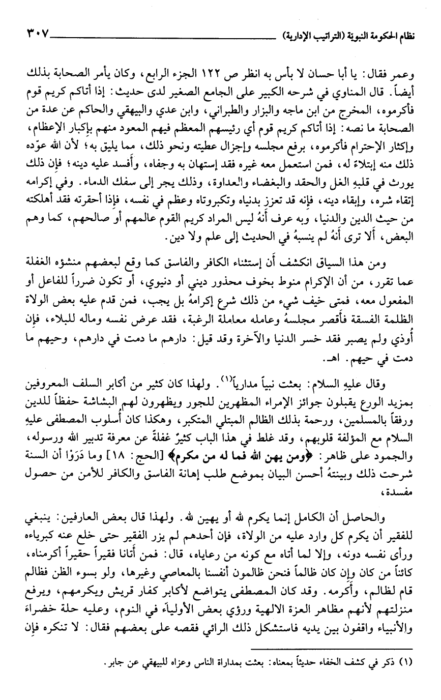 وعمر فقال: يا أبا حسان لا بأس به انظر ص 122 الجزء الرابع، وكان يأمر الصحابة بذلك أيضا. قال المناوي في شرحه الكبير على الجامع الصغير لدى حديث: إذا أتاكم كريم قوم فأكرموه، المخرج من ابن ماجه والبزار والطبراني، وابن عدي والبيهقي والحاكم عن عدة من الصحابة ما نصه: إذا أتاكم كريم قوم أي رئيسهم المعظم فيهم المعود منهم بإكبار الإعظام، وإكثار الإحترام فأكرموه، برفع مجلسه وإجزال عطيته ونحو ذلك، مما يليق به؛ لأن الله عوّده ذلك منه إبتلاء له، فمن استعمل معه غيره فقد إستهان به وجفاه، وأفسد عليه دينه؛ فإن ذلك يورث في قلبه الغل والحقد والبغضاء والعداوة، وذلك يجر إلى سفك الدماء. وفي إكرامه إتقاء شره، وإبقاء دينه، فإنه قد تعزز بدنياه وتكبروتاه وعظم في نفسه، فإذا أحقرته فقد أهلكته من حيث الدين والدنيا، وبه عرف أنه ليس المراد كريم القوم عالمهم أو صالحهم، كما وهم البعض، ألا ترى أنه لم ينسبه في الحديث إلى علم ولا دين.