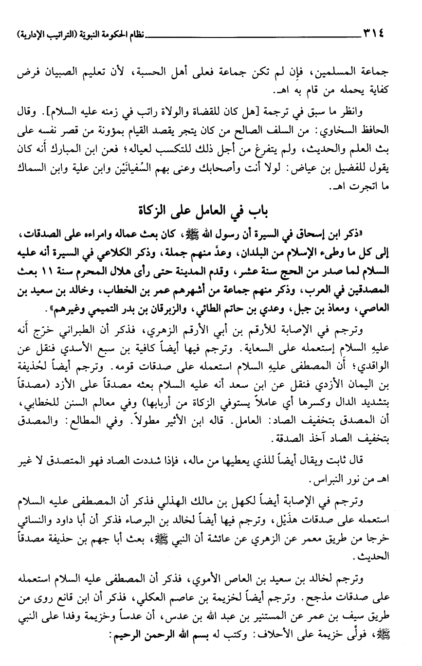 وترجم في الإصابة للأرقم بن أبي الأرقم الزهري، فذكر أن الطبراني خرّج أنه عليه السلام إستعمله على السعاية. وترجم فيها أيضا كافية بن سبع الأسدي فنقل عن الواقدي؛ أن المصطفى عليه السلام استعمله على صدقات قومه. وترجم أيضا لحذيفة بن اليمان الأزدي فنقل عن ابن سعد أنه عليه السلام بعثه مصدقا على الأزد (مصدقا بتشديد الدال وكسرها أي عاملا يستوفي الزكاة من أربابها) وفي معالم السنن للخطابي، أن المصدق بتخفيف الصاد: العامل. قاله ابن الأثير مطولا. وفي المطالع: والمصدق بتخفيف الصاد آخذ الصدقة.