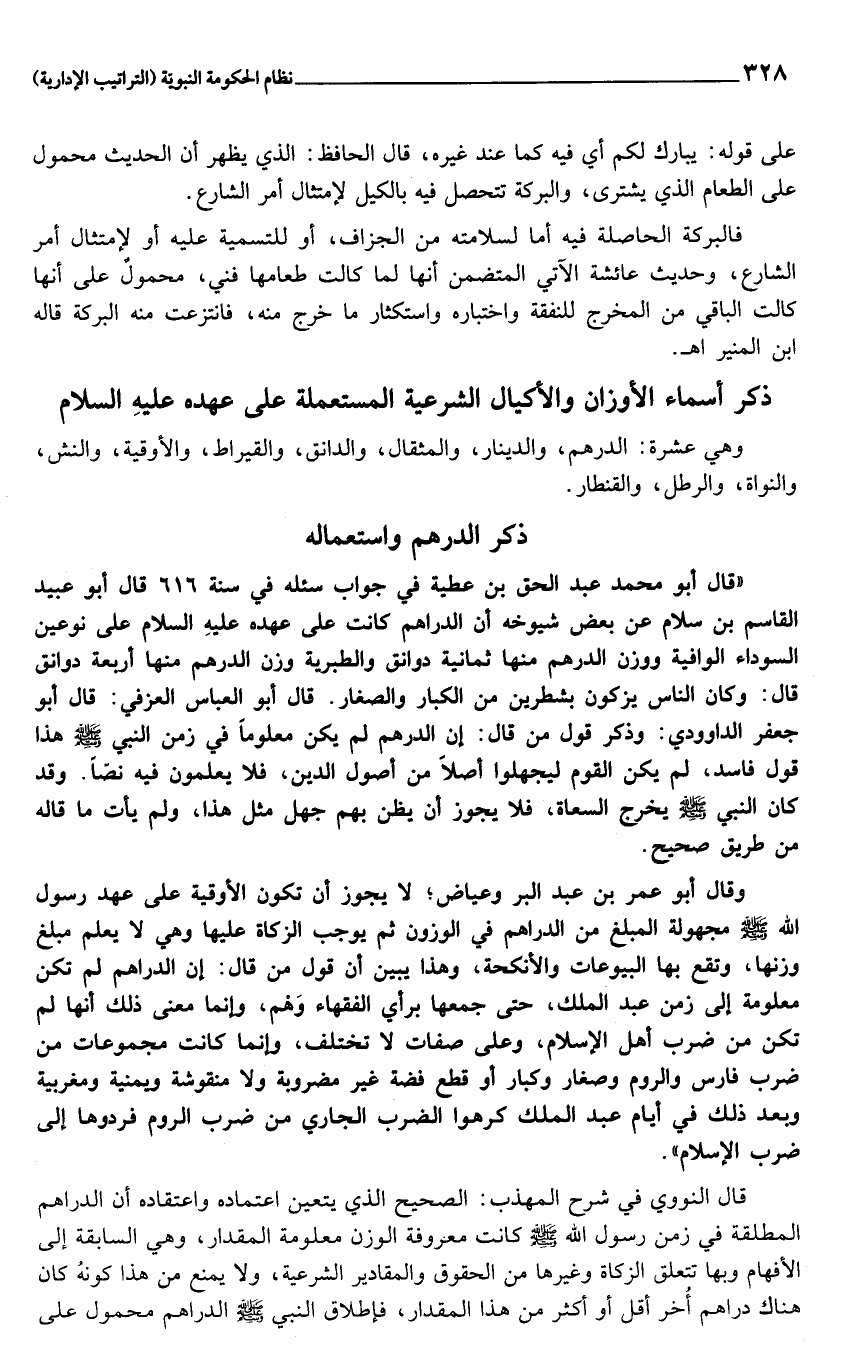 «قال أبو محمد عبد الحق بن عطية في جواب سئله في سنة 616 قال أبو عبيد القاسم بن سلام عن بعض شيوخه أن الدراهم كانت على عهده عليه السلام على نوعين السوداء الوافية ووزن الدرهم منها ثمانية دوانق والطبرية وزن الدرهم منها أربعة دوانق قال: وكان الناس يزكون بشطرين من الكبار والصغار. قال أبو العباس العزفي: قال أبو جعفر الداودي: وذكر قول من قال: إن الدرهم لم يكن معلوما في زمن النبي صلى الله عليه وسلم هذا قول فاسد، لم يكن القوم ليجهلوا أصلا من أصول الدين، فلا يعلمون فيه نصّا. وقد كان النبي صلى الله عليه وسلم يخرج السعاة، فلا يجوز أن يظن بهم جهل مثل هذا، ولم يأت ما قاله من طريق صحيح.