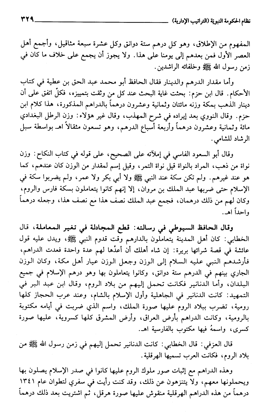 وقال الحافظ السيوطي في رسالته: قطع المجادلة في تغير المعاملة، قال الخطابي: كان أهل المدينة يتعاملون بالدارهم وقت قدوم النبي صلى الله عليه وسلم، ويدل عليه قول عائشة في قصة شرائها بريرة: إن شاء أهلك أن أعدّها لهم عدة واحدة فعدت الدراهم، فأرشدهم النبي عليه السلام إلى الوزن وجعل الوزن عيار أهل مكة، وكان الوزن الجاري بينهم في الدرهم ستة دوانق، وكانوا يتعاملون بها وهو درهم الإسلام في جميع البلدان، وأما الدنانير فكانت تحمل إليهم من بلاد الروم، وقال ابن عبد البر في التمهيد: كانت الدنانير في الجاهلية وأول الإسلام بالشام، وعند عرب الحجاز كلها رومية، تضرب ببلاد الروم عليها صورة الملك، واسم الذي ضربت في أيامه مكتوبة بالرومية، وكانت الدراهم بأرض العراق، وأرض المشرق كلها كسروية، عليها صورة كسرى، واسمه فيها مكتوب بالفارسية اهـ.