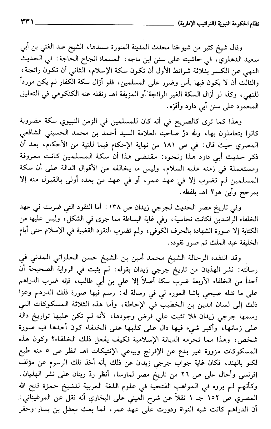 وقد انتقده الرحالة الشيخ محمد أمين بن الشيخ حسن الحلواتي المدني في رسالته: نشر الهذيان من تاريخ جرجي زيدان بقوله: لم يثبت في الرواية الصحيحة أن أحدا من الخلفاء الأربعة ضرب سكة أصلا إلا علي بن أبي طالب، فإنه ضرب الدراهم على ما نقله صبحي باشا الموره لي في رسالة له: رسم فيها صورة ذلك الدرهم وعزا ذلك إلى لسان الدين بن الخطيب في الإحاطة، وأما هذه الثلاثة المسكوكات التي رسمها جرجي زيدان فلا تثبت علي فرض وجودها، لأنه لم تكن عليها تواريخ دالة على زمانها، وأكبر شيء فيها دال على كذبها على الخلفاء كون أحدها فيه صورة شخص، وهذا مما تحرمه الديانة الإسلامية فكيف يفعل ذلك الخلفاء؟ وكون هذه المسكوكات مزورة غير بدع عن الإفرنج وبياعي الإنتيكات اهـ انظر ص 5 منه طبع لكنو بالهند، فكان غاية جواب جرجي زيدان عن ذلك بأنه أخذ تلك الرسوم عن مؤلف إفرنسي وأحال على ص 26 من تاريخ مصر لمارسا، أنظر ردّ رينان على نشر الهذيان.