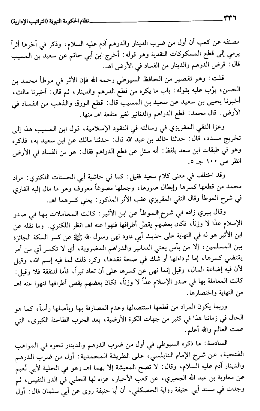 مصنفه عن كعب أن أول من ضرب الدينار والدرهم آدم عليه السلام، وذكر في آخرها أثرا يرمي إلى قطع المسكوكات النقدية وهو قوله: أخرج ابن أبي حاتم عن سعيد بن المسيب قال: قرض الدرهم والدينار من الفساد في الأرض اهـ.