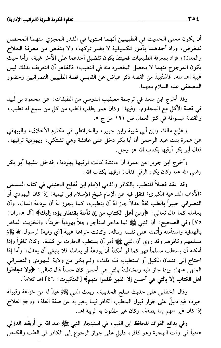 وقد عقد فصلا للتطبب بالكافر والذمي الإمام ابن مفلح الحنبلي في كتابه المسمى «الآداب الشرعية الكبرى» فنقل فيه عن الإمام شيخ الإسلام ابن تيمية: إذا كان اليهودي أو النصراني خبيرا بالطب ثقة عدلا جاز له أن يتطبب، كما يجوز له أن يودعه المال، وأن يعامله كما قال تعالى: وَمِنْ أَهْلِ الْكِتابِ مَنْ إِنْ تَأْمَنْهُ بِقِنْطارٍ يُؤَدِّهِ إِلَيْكَ [آل عمران: