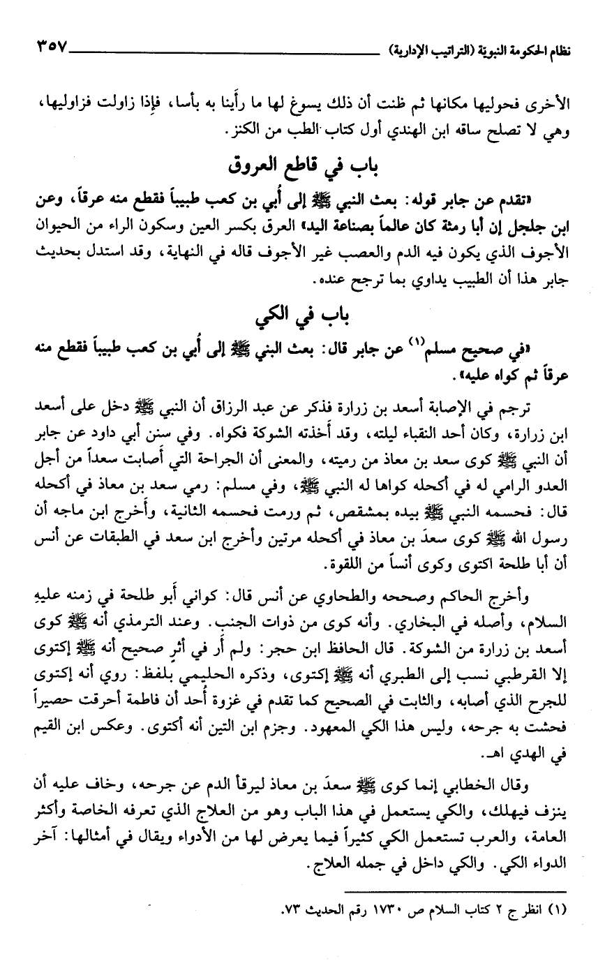 ترجم في الإصابة أسعد بن زرارة فذكر عن عبد الرزاق أن النبي صلى الله عليه وسلم دخل على أسعد ابن زرارة، وكان أحد النقباء ليلته، وقد أخذته الشوكة فكواه. وفي سنن أبي داود عن جابر أن النبي صلى الله عليه وسلم كوى سعد بن معاذ من رميته، والمعنى أن الجراحة التي أصابت سعدا من أجل العدو الرامي له في أكحله كواها له النبي صلى الله عليه وسلم، وفي مسلم: رمي سعد بن معاذ في أكحله قال: فحسمه النبي صلى الله عليه وسلم بيده بمشقص، ثم ورمت فحسمه الثانية، وأخرج ابن ماجه أن رسول الله صلى الله عليه وسلم كوى سعد بن معاذ في أكحله مرتين وأخرج ابن سعد في الطبقات عن أنس أن أبا طلحة اكتوى وكوى أنسا من اللقوة.