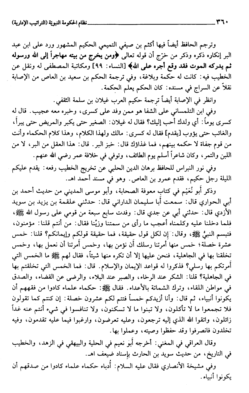 وترجم الحافظ أيضا فيها أكثم بن صيفي التميمي الحكيم المشهور ورد على ابن عبد البر إنكاره ذكره وذكر من خرّج أن قوله تعالى وَمَنْ يَخْرُجْ مِنْ بَيْتِهِ مُهاجِراً إِلَى اللَّهِ وَرَسُولِهِ ثُمَّ يُدْرِكْهُ الْمَوْتُ فَقَدْ وَقَعَ أَجْرُهُ عَلَى اللَّهِ [النساء: 99] ومكاتبة المصطفى له ونقل عن الخطيب فيه: كانت له حكمة وبلاغة، وفي ترجمة الحكم بن سعيد بن العاص من الإصابة نقلا عن السراج في مسنده: كان الحكم يعلم الحكمة.