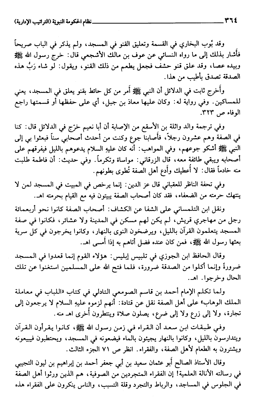 ولما تكلم الإمام أحمد بن قاسم الصومعي التادلي في كتاب «اللباب في معاملة الملك الوهاب» على أهل الصفة نقل عن قتادة: أنهم لزموه عليه السلام لا يرجعون إلى تجارة، ولا إلى زرع ولا إلى ضرع، يصلون صلاة وينتظرون أخرى اهـ منه.