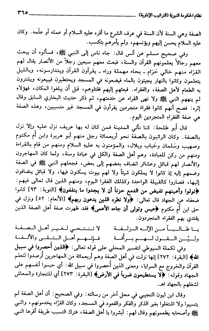 وفي تكملة السيوطي لتفسير المحلي على قوله تعالى: الَّذِينَ أُحْصِرُوا فِي سَبِيلِ اللَّهِ [البقرة: 272] إنها نزلت في أهل الصفة وهم أربعمائة من المهاجرين أرصدوا لتعلم القرآن والخروج مع السرايا، ومعنى الذين أحصروا في سبيل الله: أي حبسوا أنفسهم على الجهاد وقوله: لا يَسْتَطِيعُونَ ضَرْباً فِي الْأَرْضِ [البقرة: 273] أي للتجارة والمعاش لشغلهم بالجهاد اهـ.