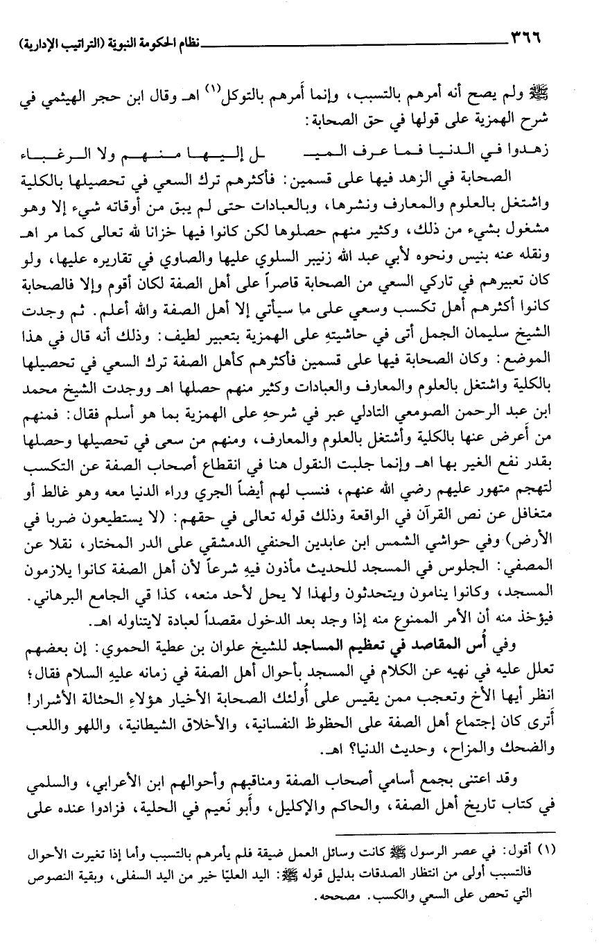 الصحابة في الزهد فيها على قسمين: فأكثرهم ترك السعي في تحصيلها بالكلية واشتغل بالعلوم والمعارف ونشرها، وبالعبادات حتى لم يبق من أوقاته شيء إلا وهو مشغول بشيء من ذلك، وكثير منهم حصلوها لكن كانوا فيها خزانا لله تعالى كما مر اهـ ونقله عنه بنيس ونحوه لأبي عبد الله زنيبر السلوي عليها والصاوي في تقاريره عليها، ولو كان تعبيرهم في تاركي السعي من الصحابة قاصرا على أهل الصفة لكان أقوم وإلا فالصحابة كانوا أكثرهم أهل تكسب وسعي على ما سيأتي إلا أهل الضفة والله أعلم. ثم وجدت الشيخ سليمان الجمل أتى في حاشيته على الهمزية بتعبير لطيف: وذلك أنه قال في هذا الموضع: وكان الصحابة فيها على قسمين فأكثرهم كأهل الصفة ترك السعي في تحصيلها بالكلية واشتغل بالعلوم والمعارف والعبادات وكثير منهم حصلها اهـ ووجدت الشيخ محمد ابن عبد الرحمن الصومعي التادلي عبر في شرحه على الهمزية بما هو أسلم فقال: فمنهم من أعرض عنها بالكلية وأشتغل بالعلوم والمعارف، ومنهم من سعى في تحصيلها وحصلها بقدر نفع الغير بها اهـ وإنما جلبت النقول هنا في انقطاع أصحاب الصفة عن التكسب لتهجم متهور عليهم رضي الله عنهم، فنسب لهم أيضا الجري وراء الدنيا معه وهو غالط أو متغافل عن نص القرآن في الواقعة وذلك قوله تعالى في حقهم: (لا يستطيعون ضربا في الأرض) وفي حواشي الشمس ابن عابدين الحنفي الدمشقي على الدر المختار، نقلا عن المصفي: الجلوس في المسجد للحديث مأذون فيه شرعا لأن أهل الصفة كانوا يلازمون المسجد، وكانوا ينامون ويتحدثون ولهذا لا يحل لأحد منعه، كذا قي الجامع البرهاني.